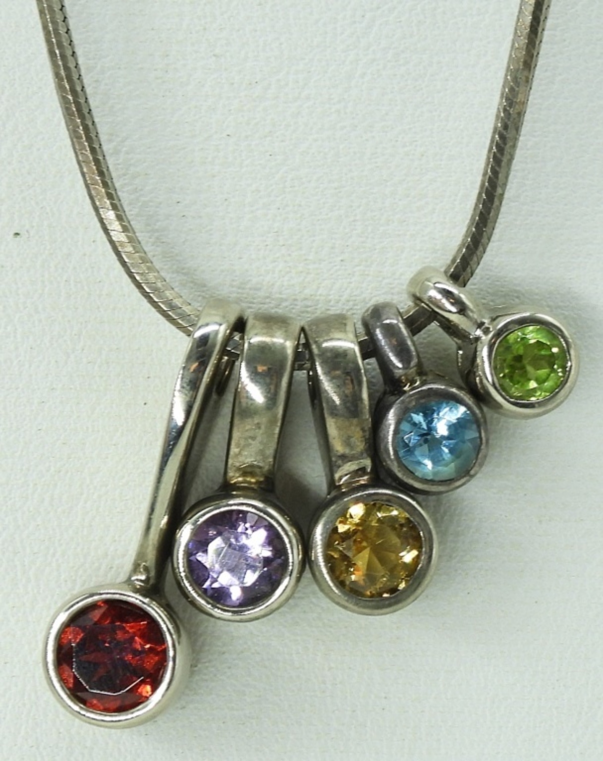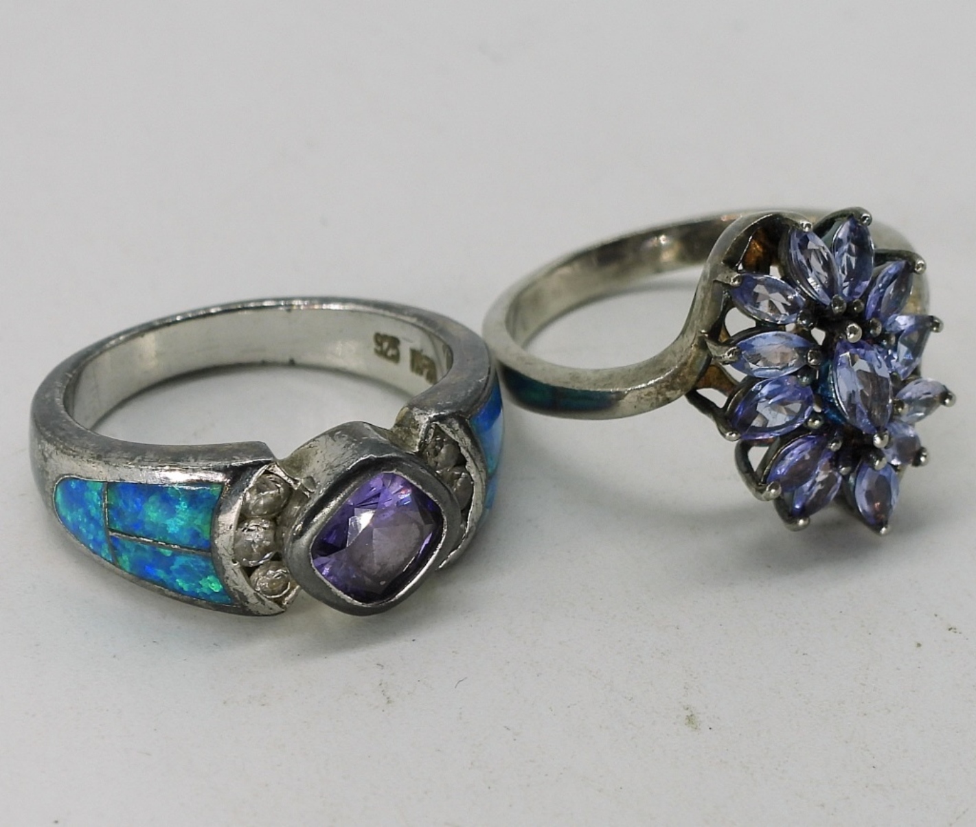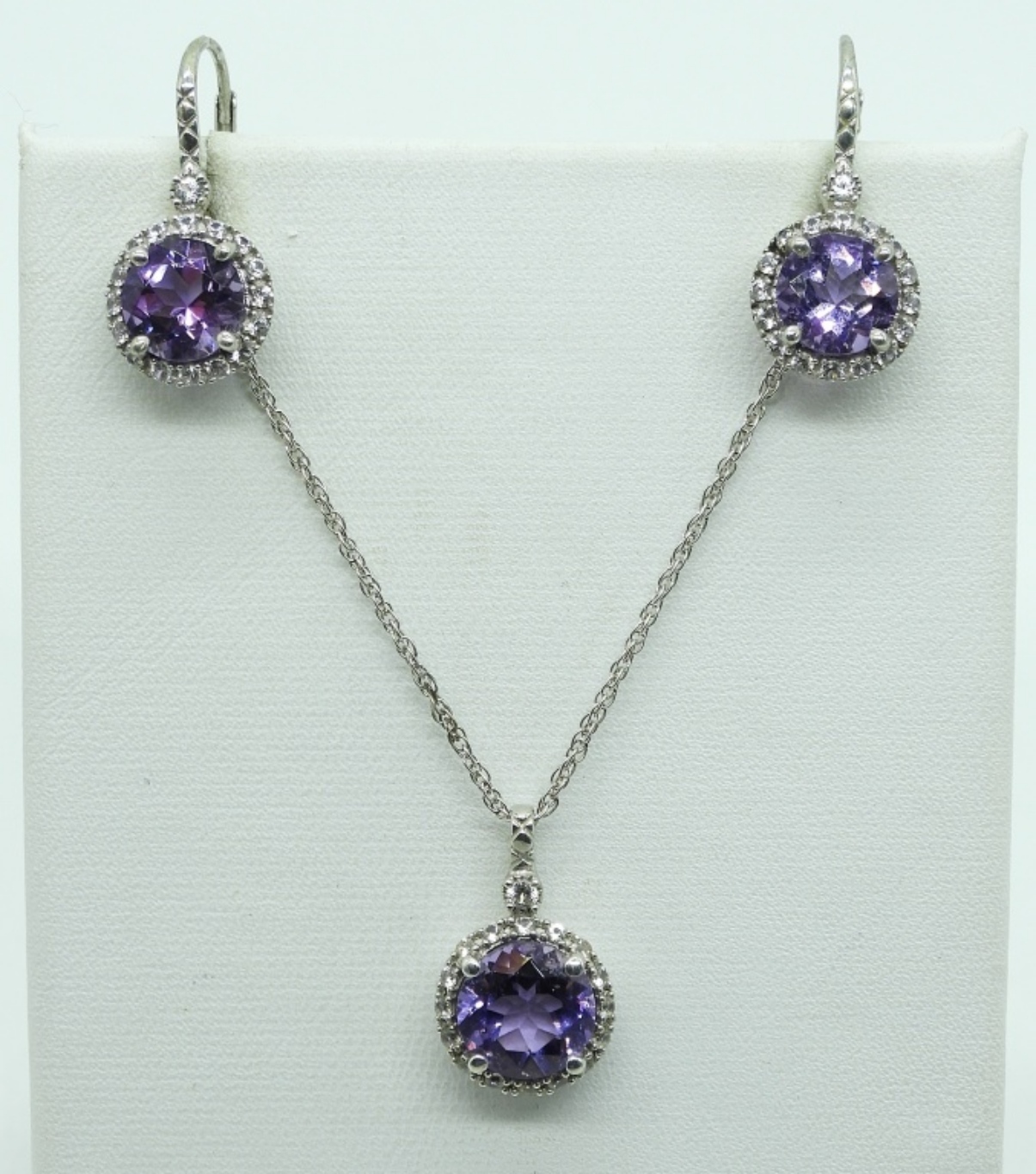Matching 925 Amethyst necklace & pierced earrings, 18″. Two amethyst rings, sizes 7-8. Multi gemstone pendant necklace, 18″. (16.8 dwt)