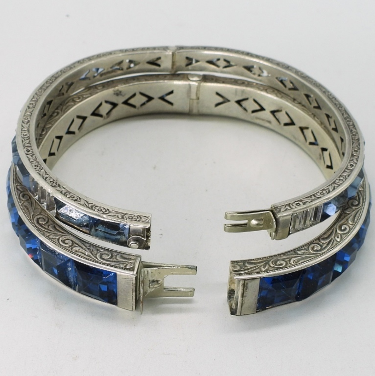 Two sterling bangle bracelets with large simulated gemstones. 6-7″. (32.1 dwt)