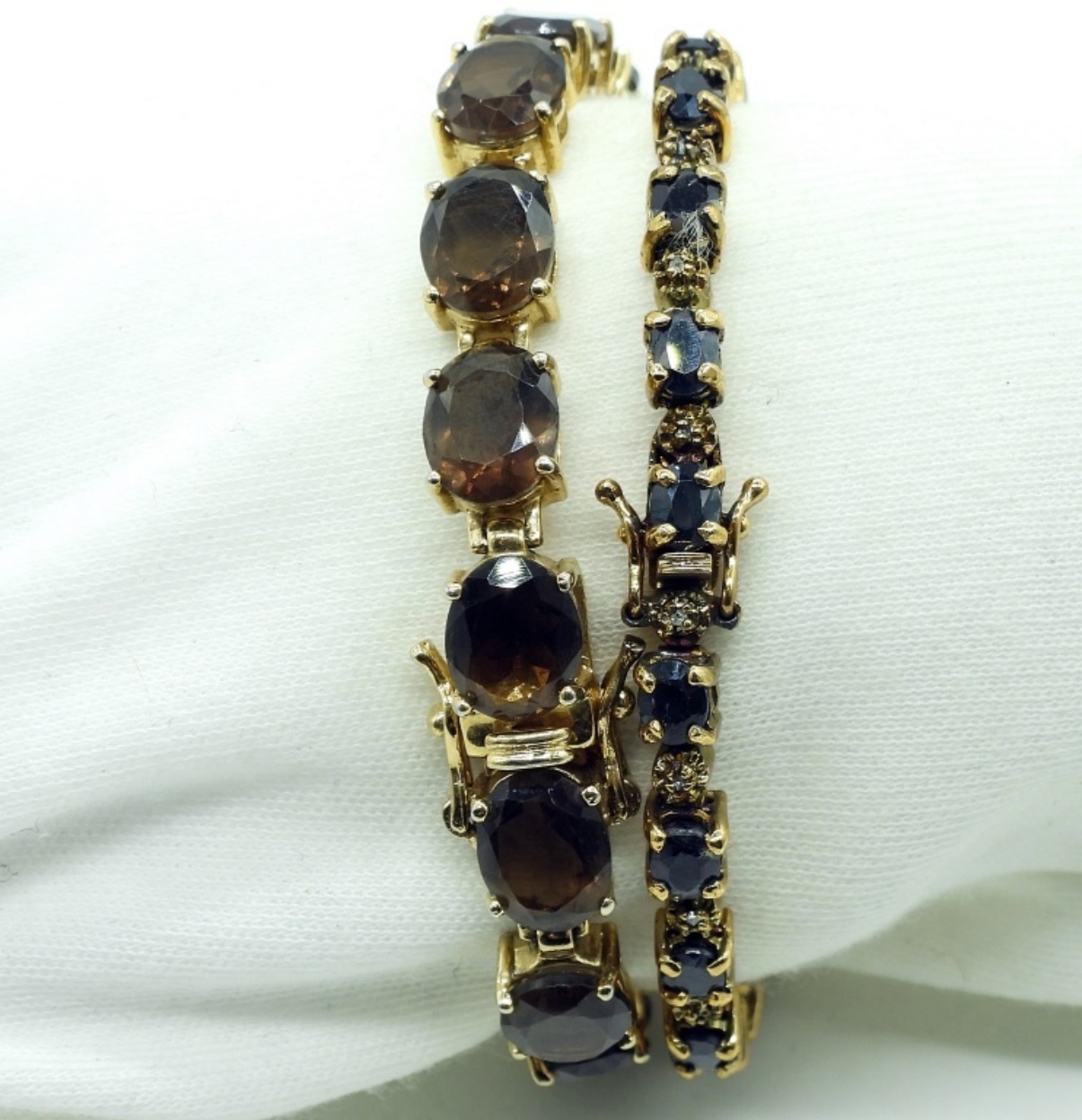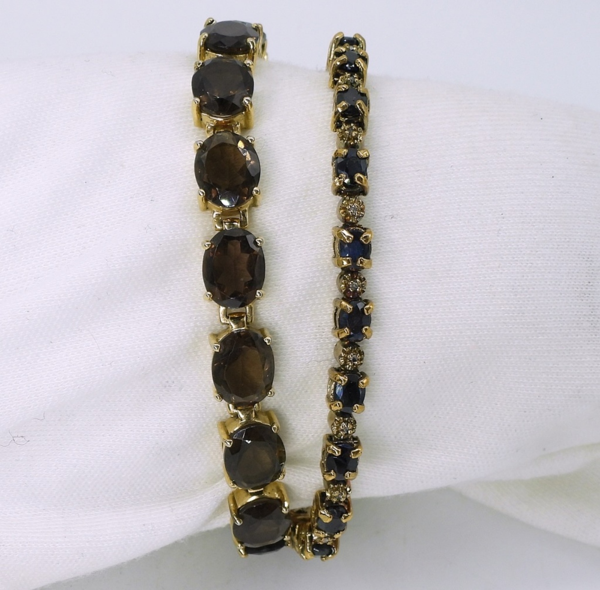 Two sterling, gold tone bracelets. Smokey Quartz & Sapphire (not verified genuine), 7.5″. (20.6 dwt)