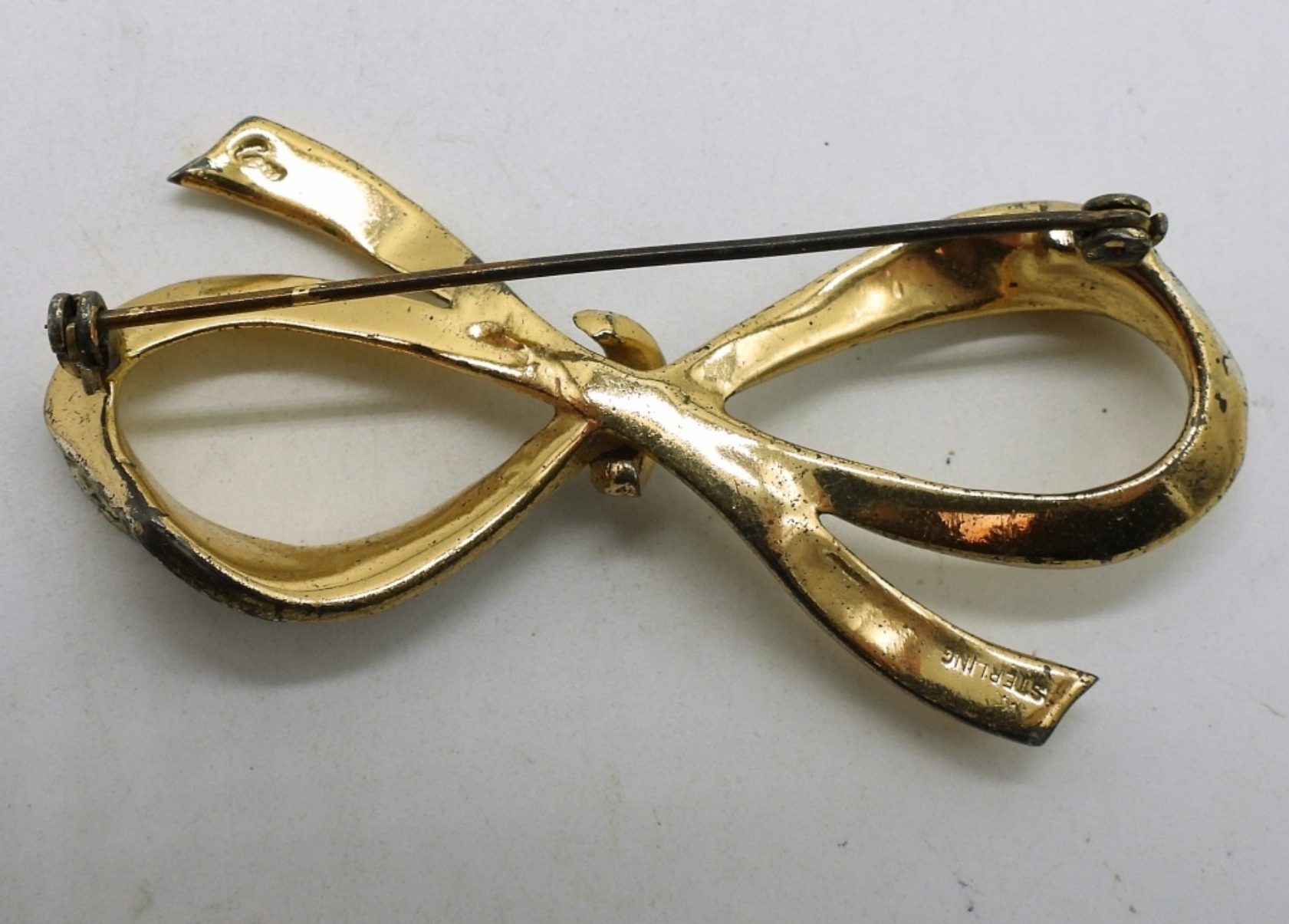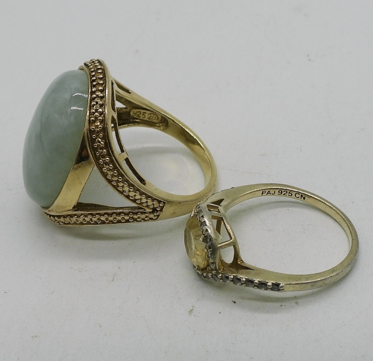 Michael Valitutti “Gems en vogue” collection. Green jade gold toned sterling ring, size 9. Other ring, size 7. Gold tone vintage Coro bow brooch, 2.5″ wide. (18 dwt)