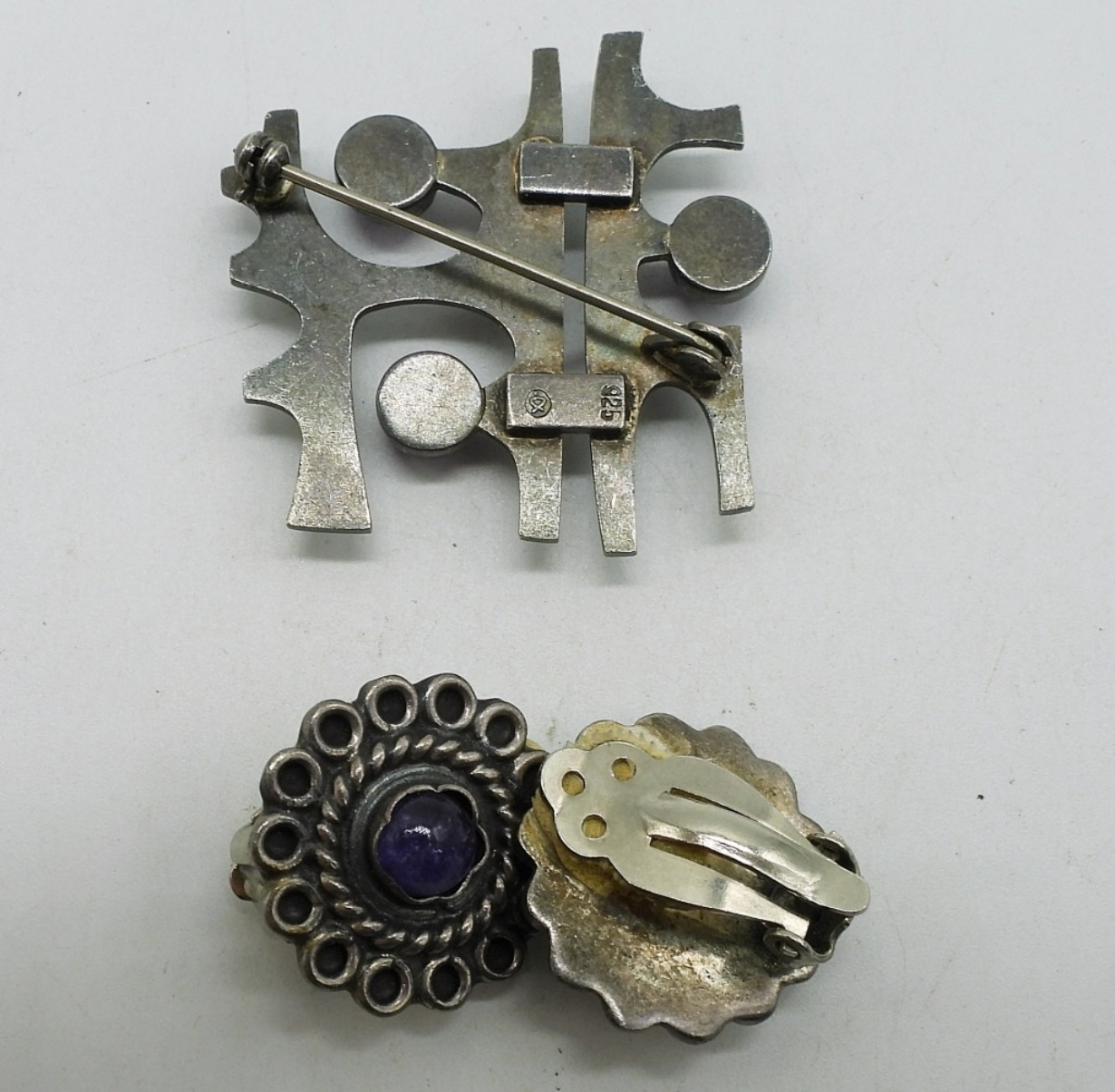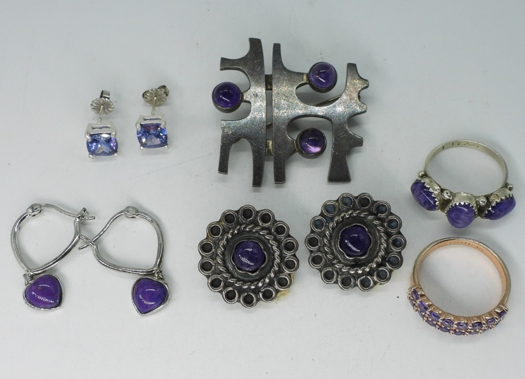 Two sterling rings, charoite & amethyst, sizes 7 & 8. 3 pair earrings, pierced & clip on. Sterling brooch, 1.5″. (21.9 dwt)