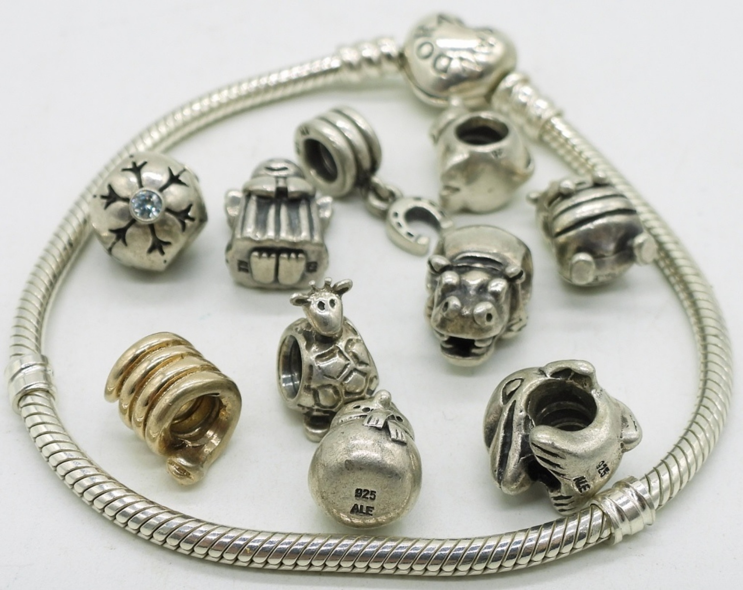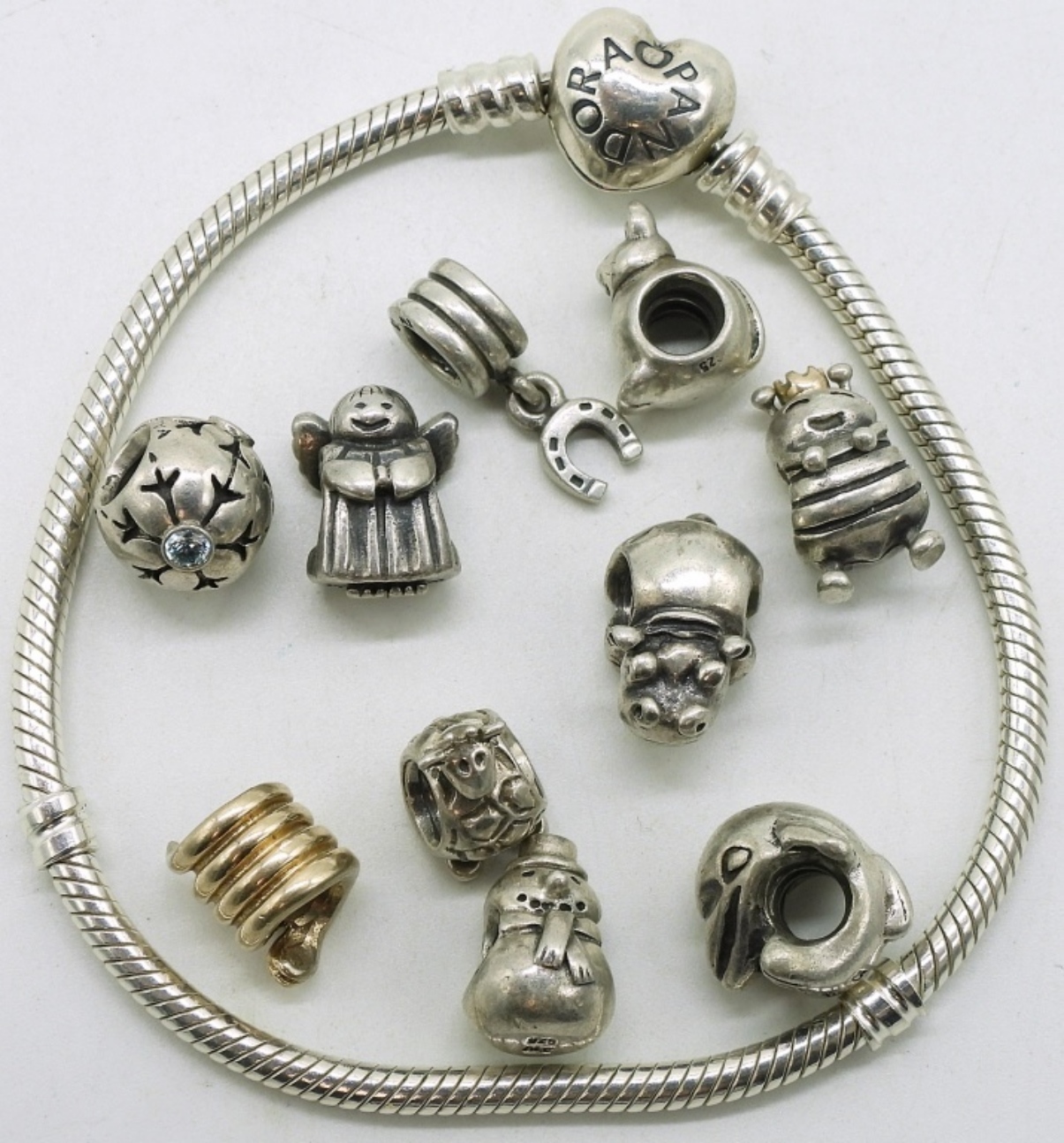 Pandora heart clasp bracelet, 7″ with 10 sterling beads (marked ALE 925). (32.7 dwt)