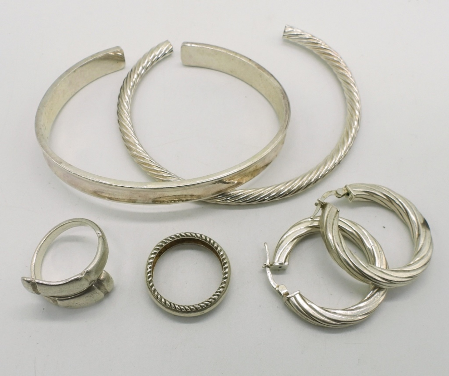 Two sterling cuff bracelets, 7-8″. Pierced sterling hoop earrings. Two sterling rings, size 7. (32.1 dwt)