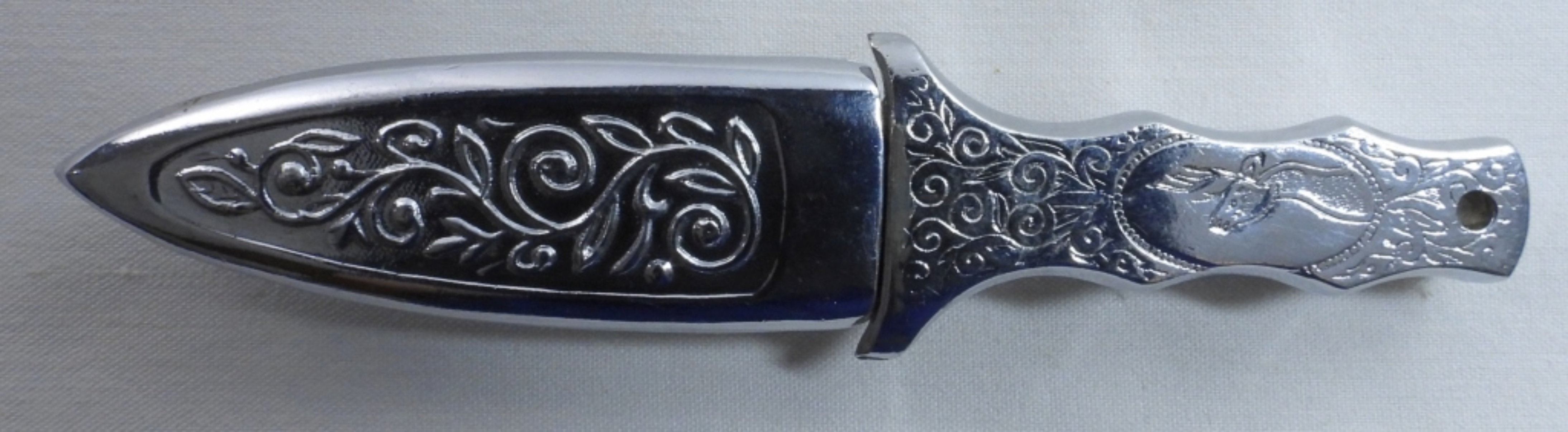Silver-tone and ornate design featuring a deer on the handle, the sheath has a clip, the dagger is 6 1/2″ total length, Pakistan