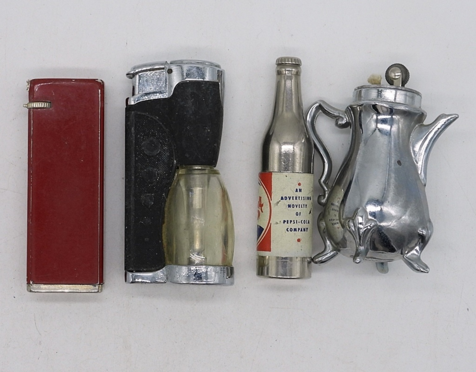 Four novelty beverage lighters. Coffee Machine, Pepsi, Tea Kettle (Nu Trend Cory Spice n Lite Lighter-Missing Cap) and Budweiser. 2.5″ tall.
