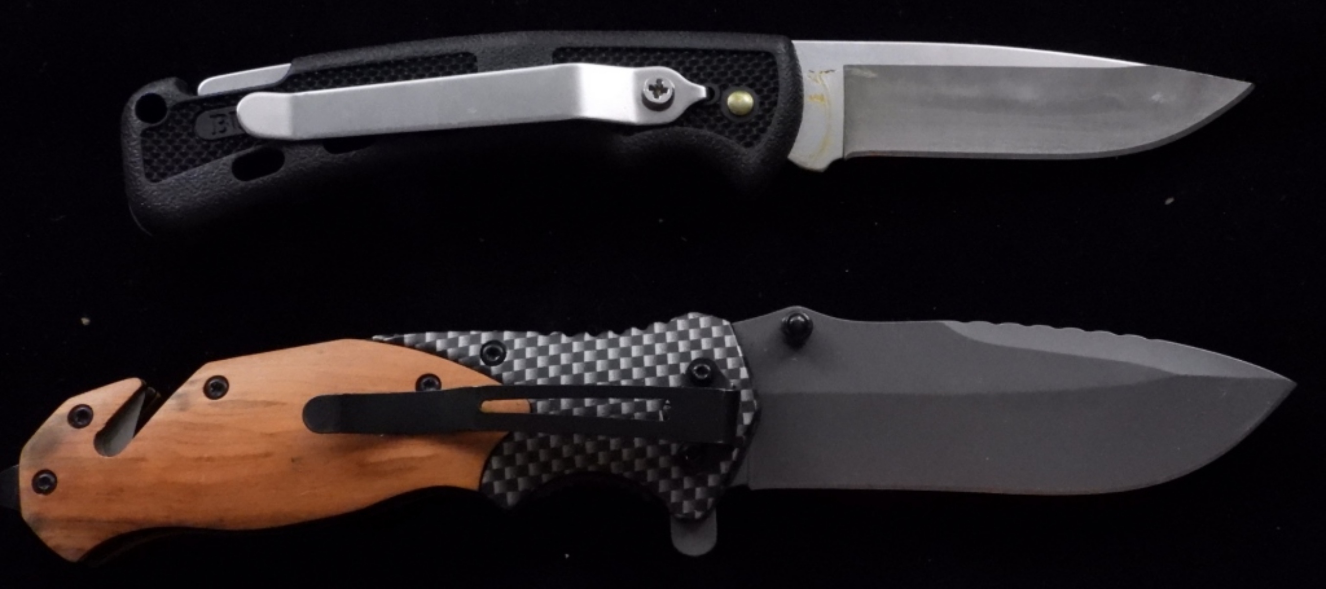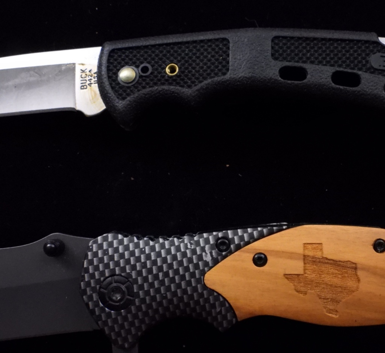 1) can break a window and cut a seatbelt. Also has the state of Texas on the handle. 2) Buck #442. Both have belt clips