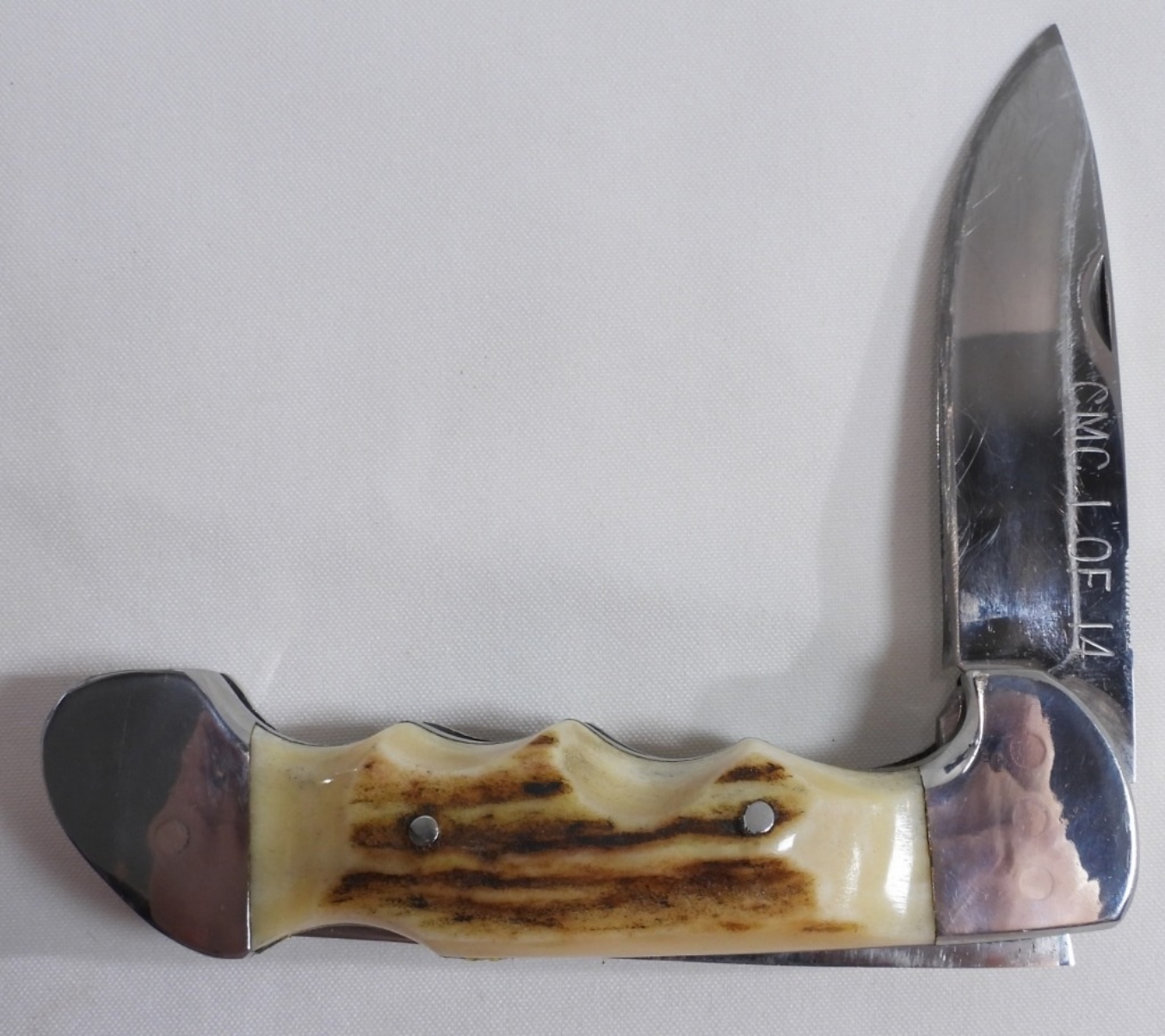 Stag handle with brown leather sheath inscribed CMC 1 of 14/reverse side (John Sparks 12-25-87