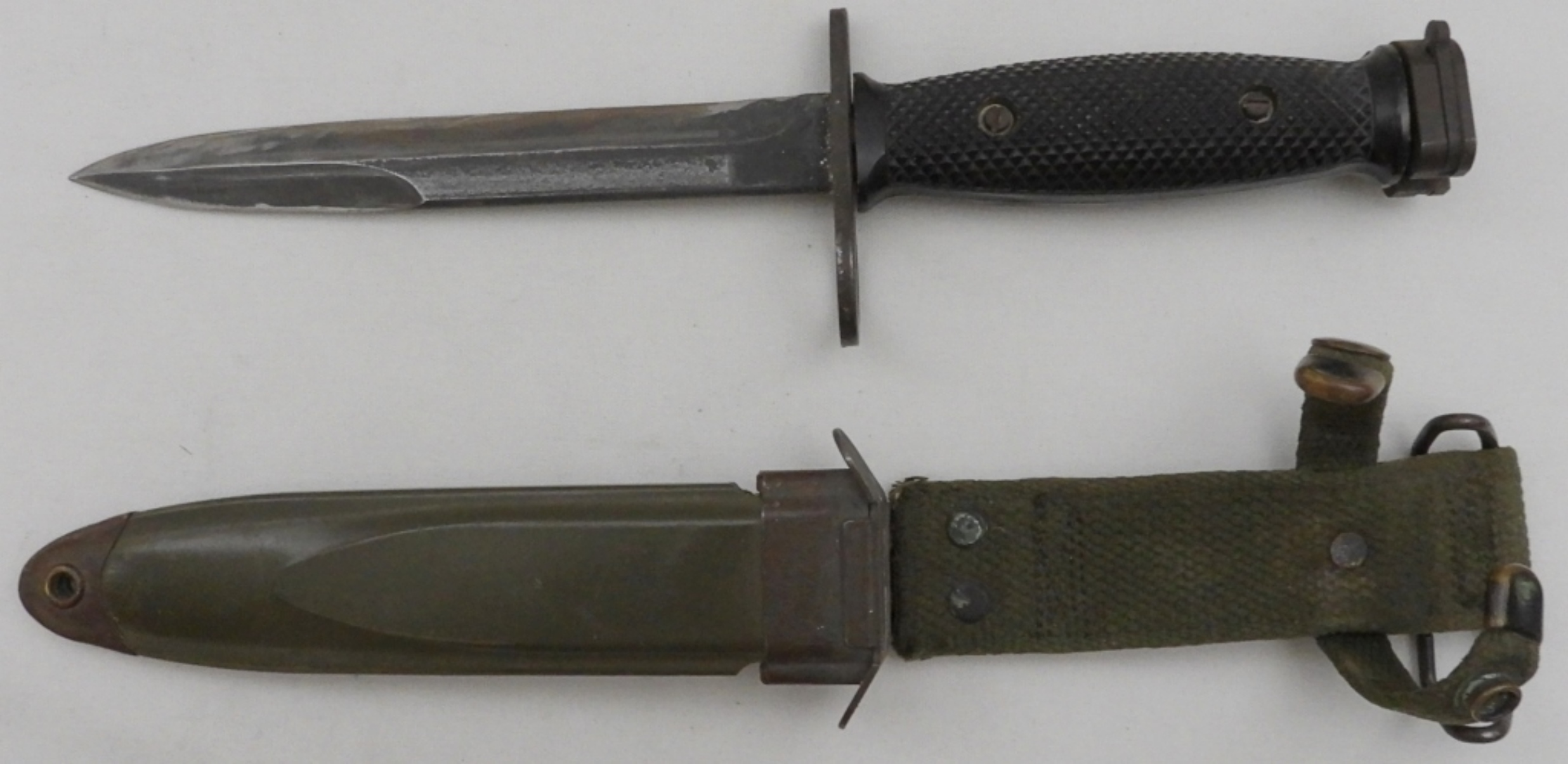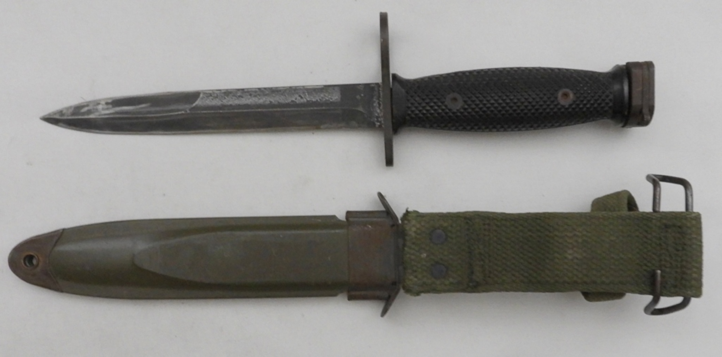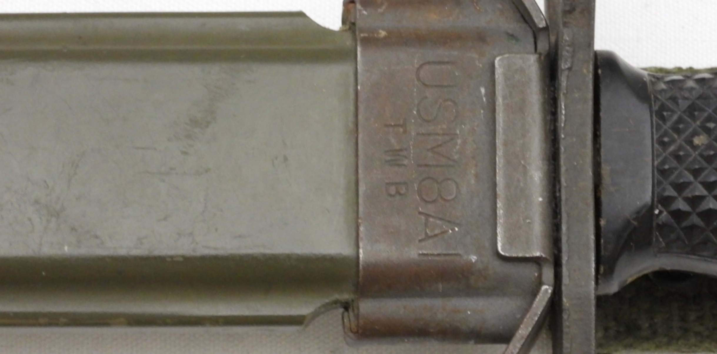 U.S. M7 Imperial, blade length 7″, scabbard snaps have oxidation, U.S. M8A1 T.W.B.