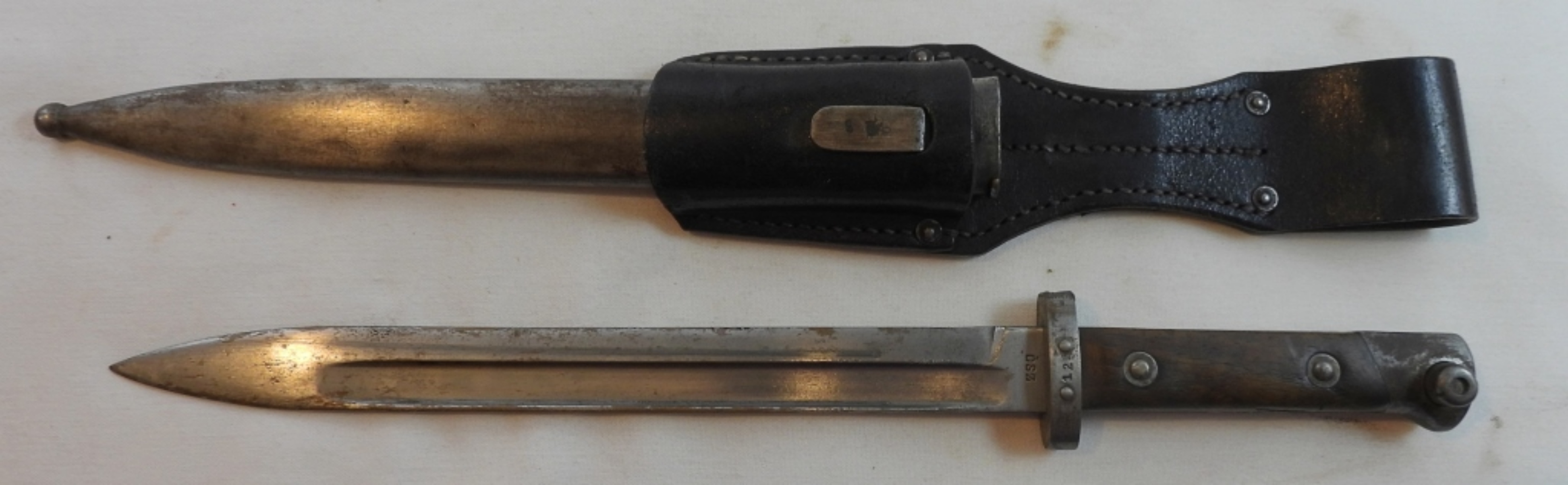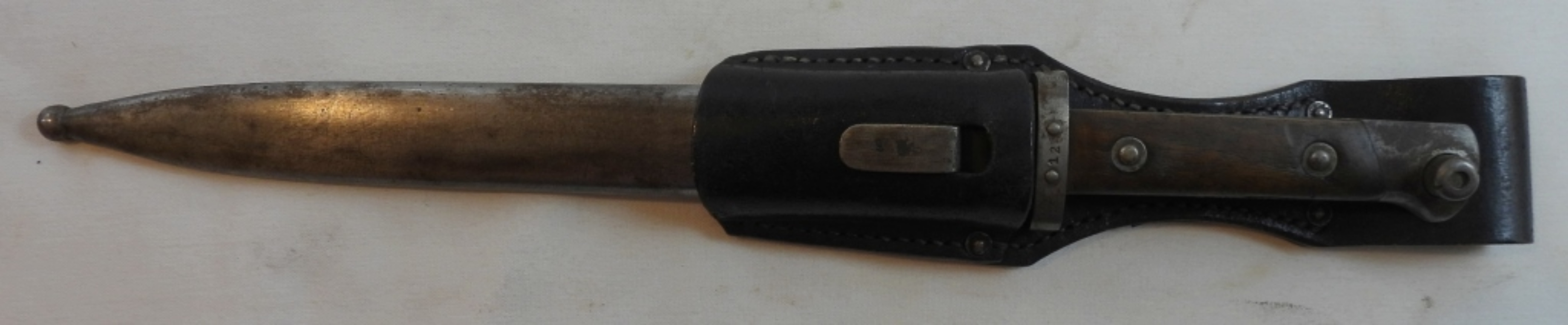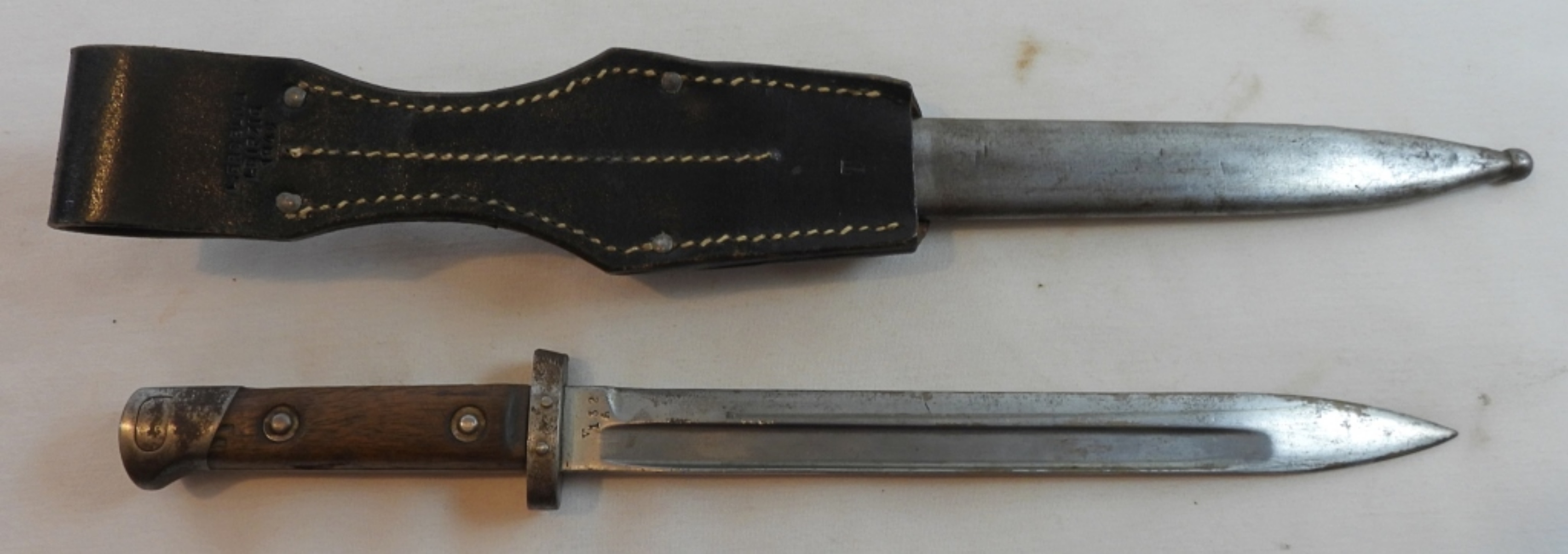 German bayonet with scabbard and leather holder, leather is marked, L.erselius Leipzig 1946, blade is almost 10″, wooden handle