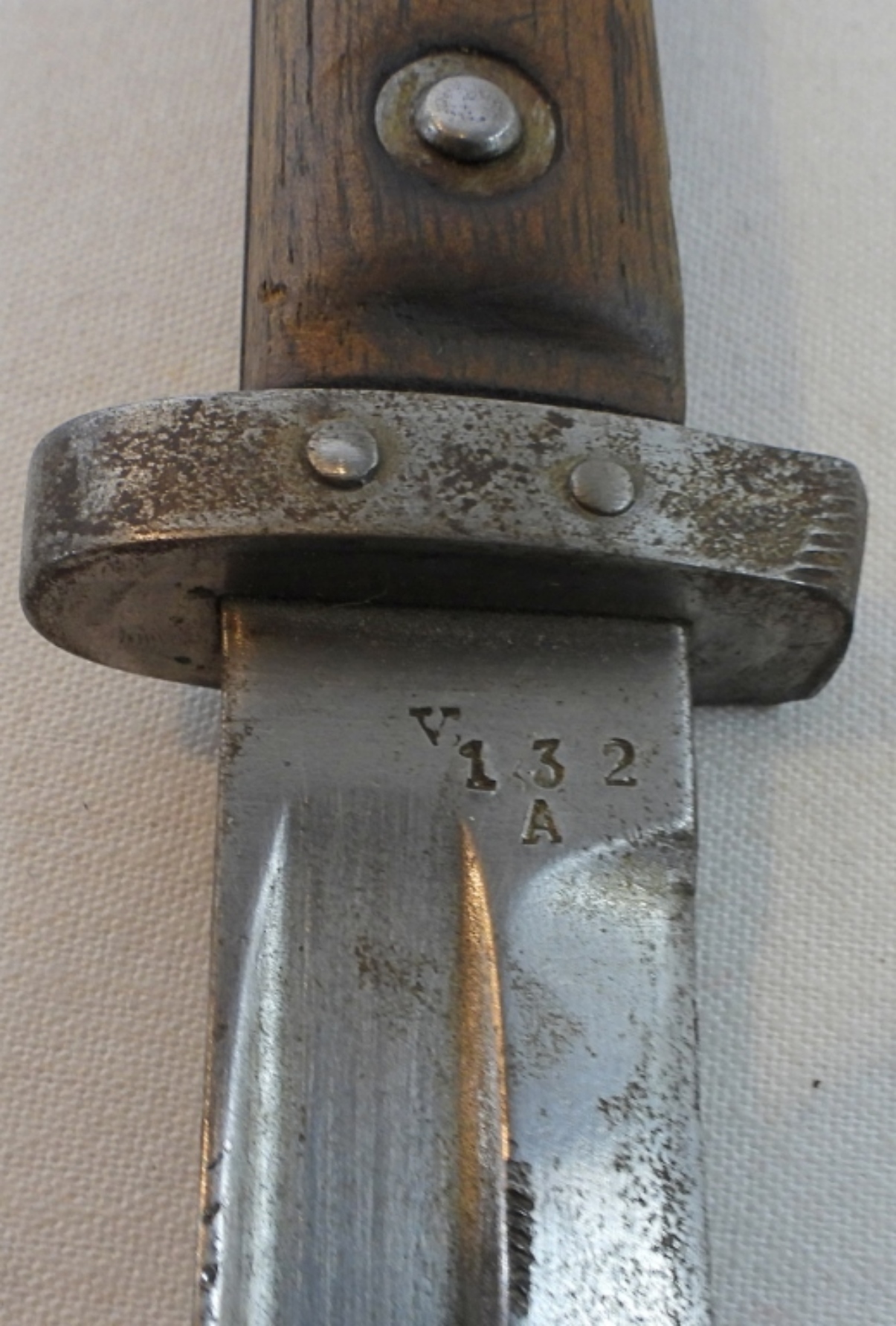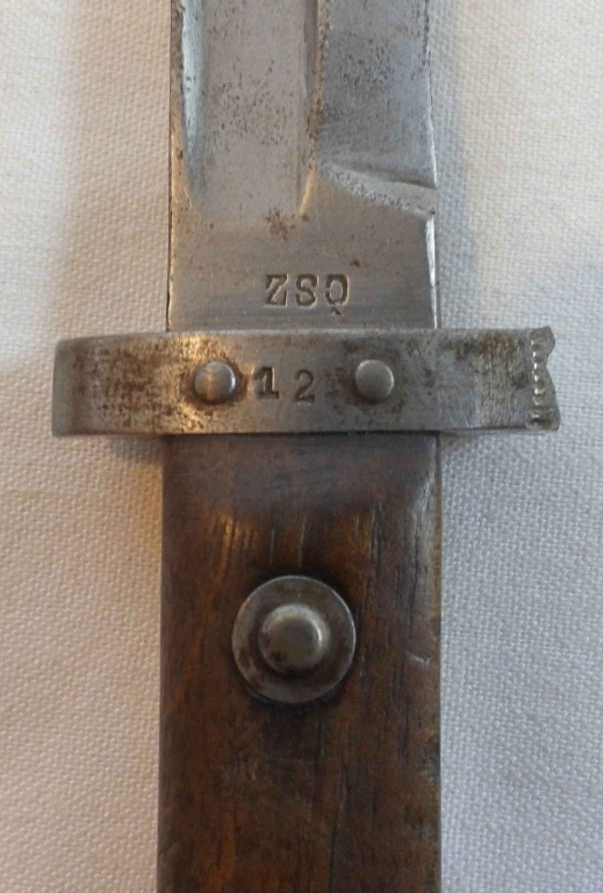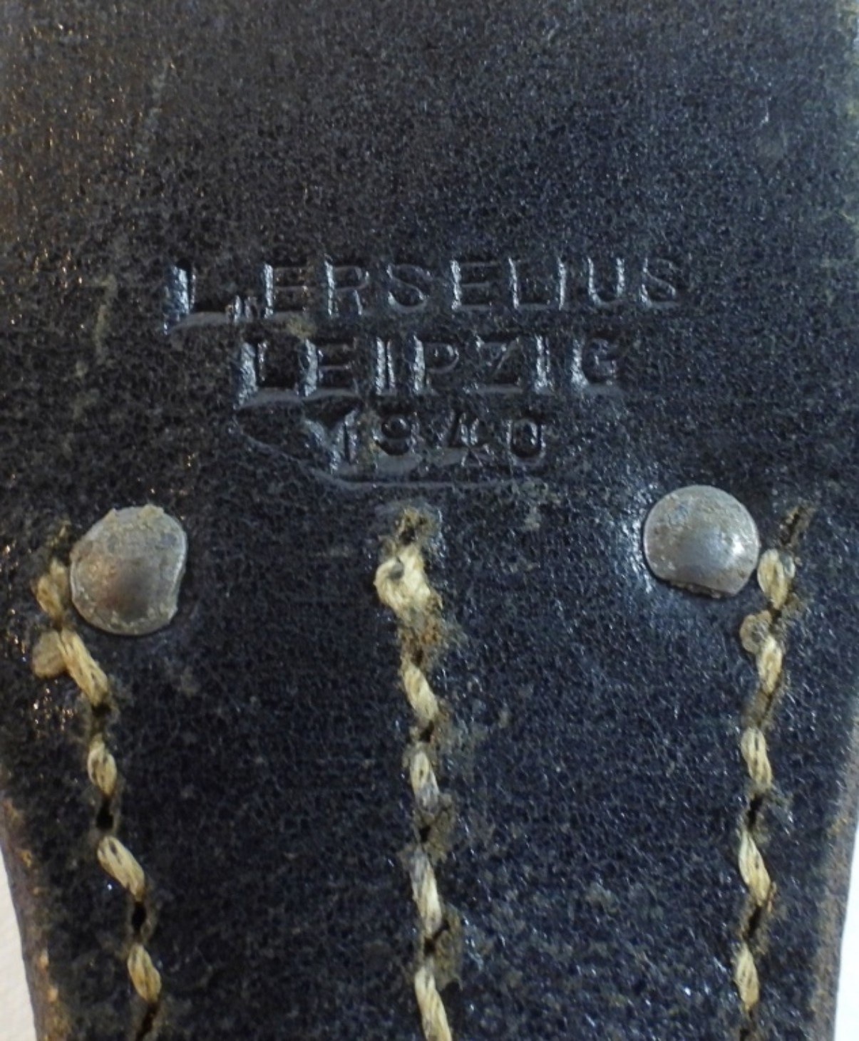 German bayonet with scabbard and leather holder, leather is marked, L.erselius Leipzig 1946, blade is almost 10″, wooden handle