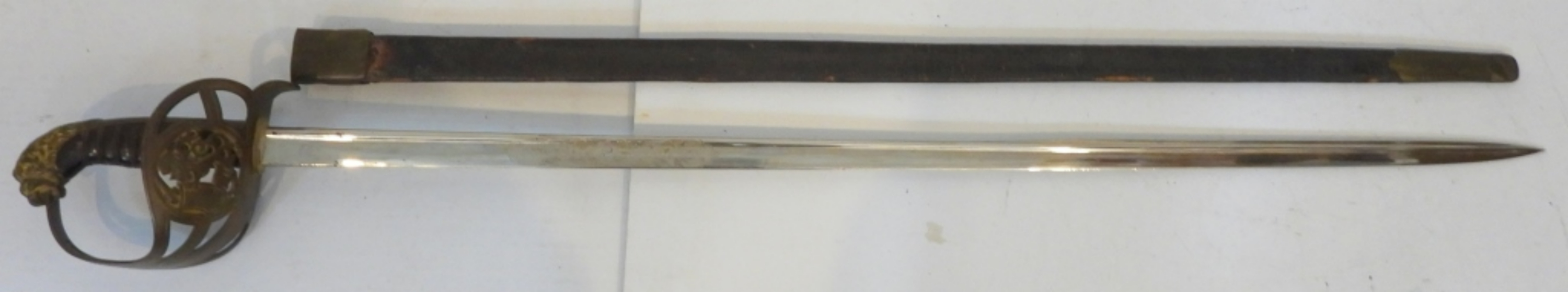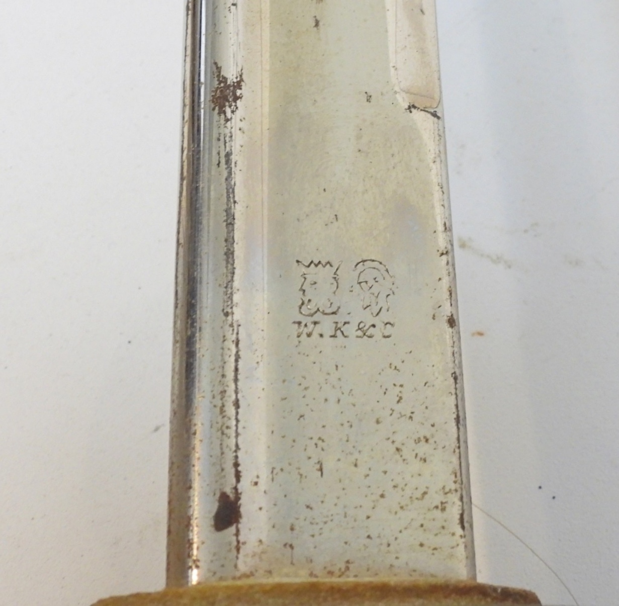 Imperial German, W. K&C on the blade, blade length 33″, scabbard is not original to the sword and is too short