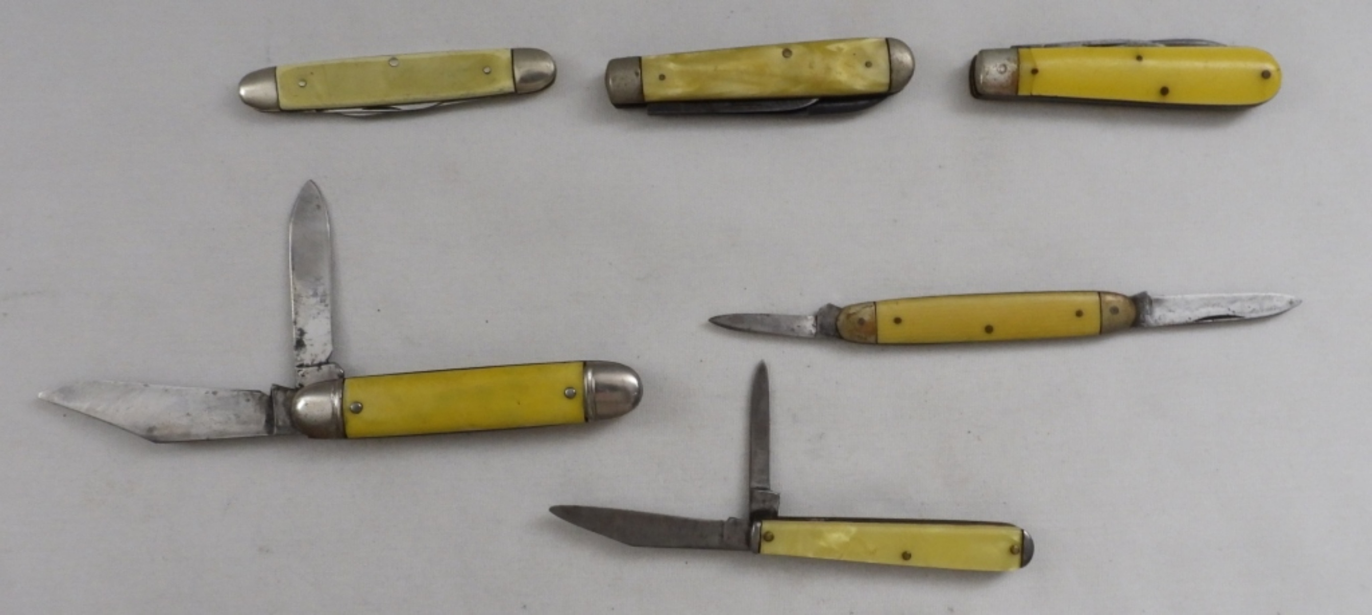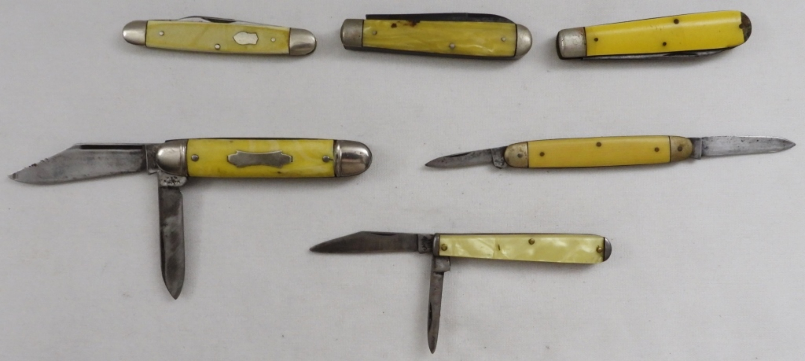 2 blades each, handles vary in length from 3″ to 3 1/2″, rust on some