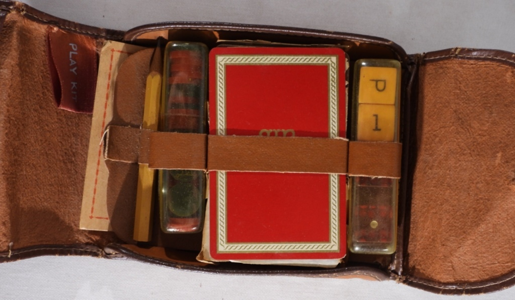 Comes with Gin Rummy score pad, Instructions for Gin Rummy, and Chess, a Chess-Checker board. Set of playing cards, Travel case with “GREETINGS” The Weatherhead Company, checker pieces, 4 dice. Travel case does have some