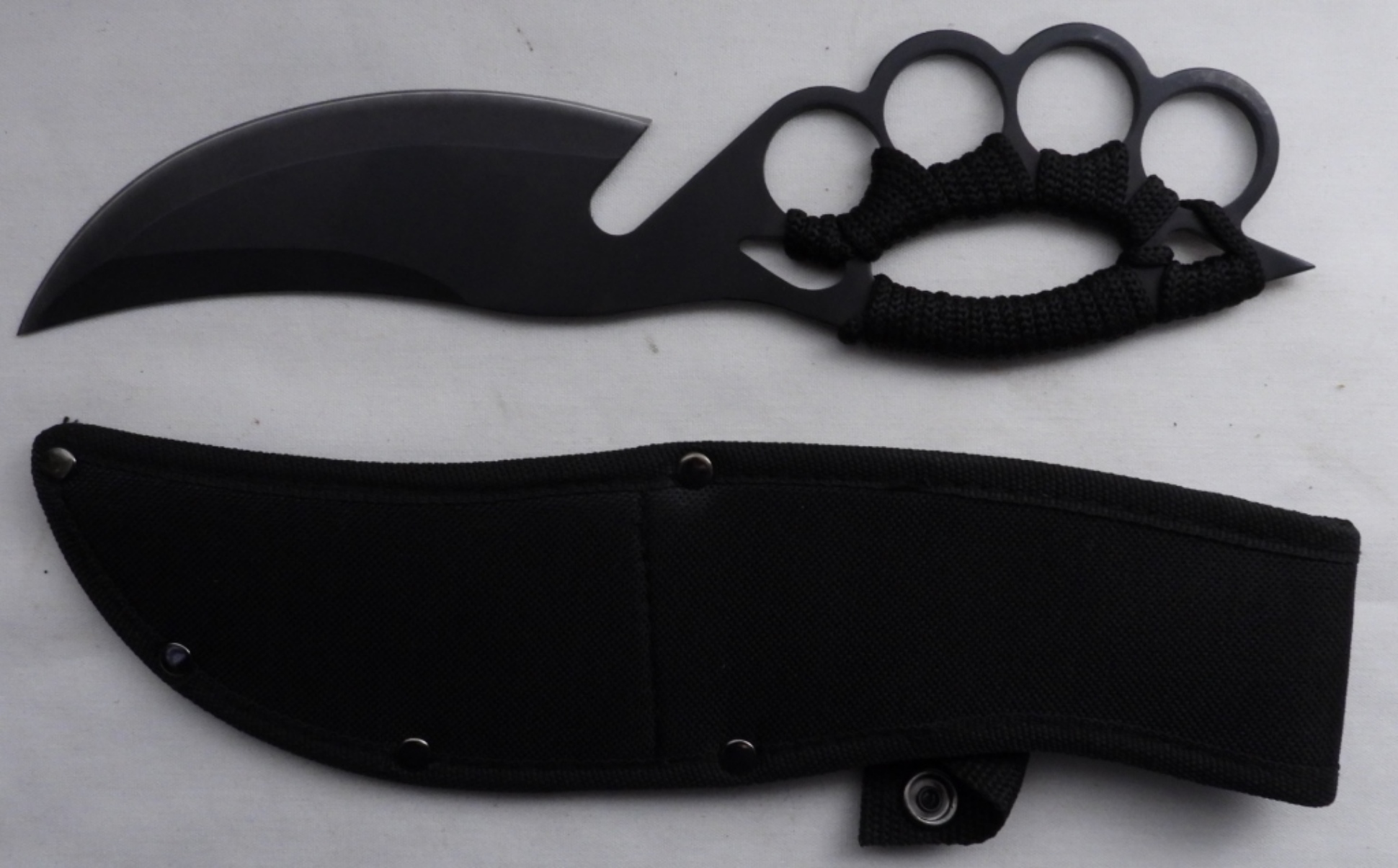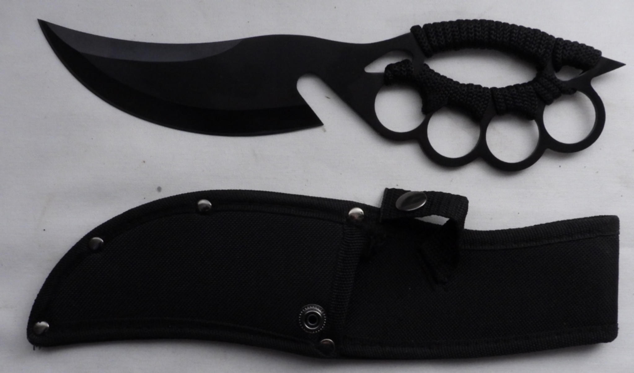 Has a black nylon sheath and is wrapped in paracord