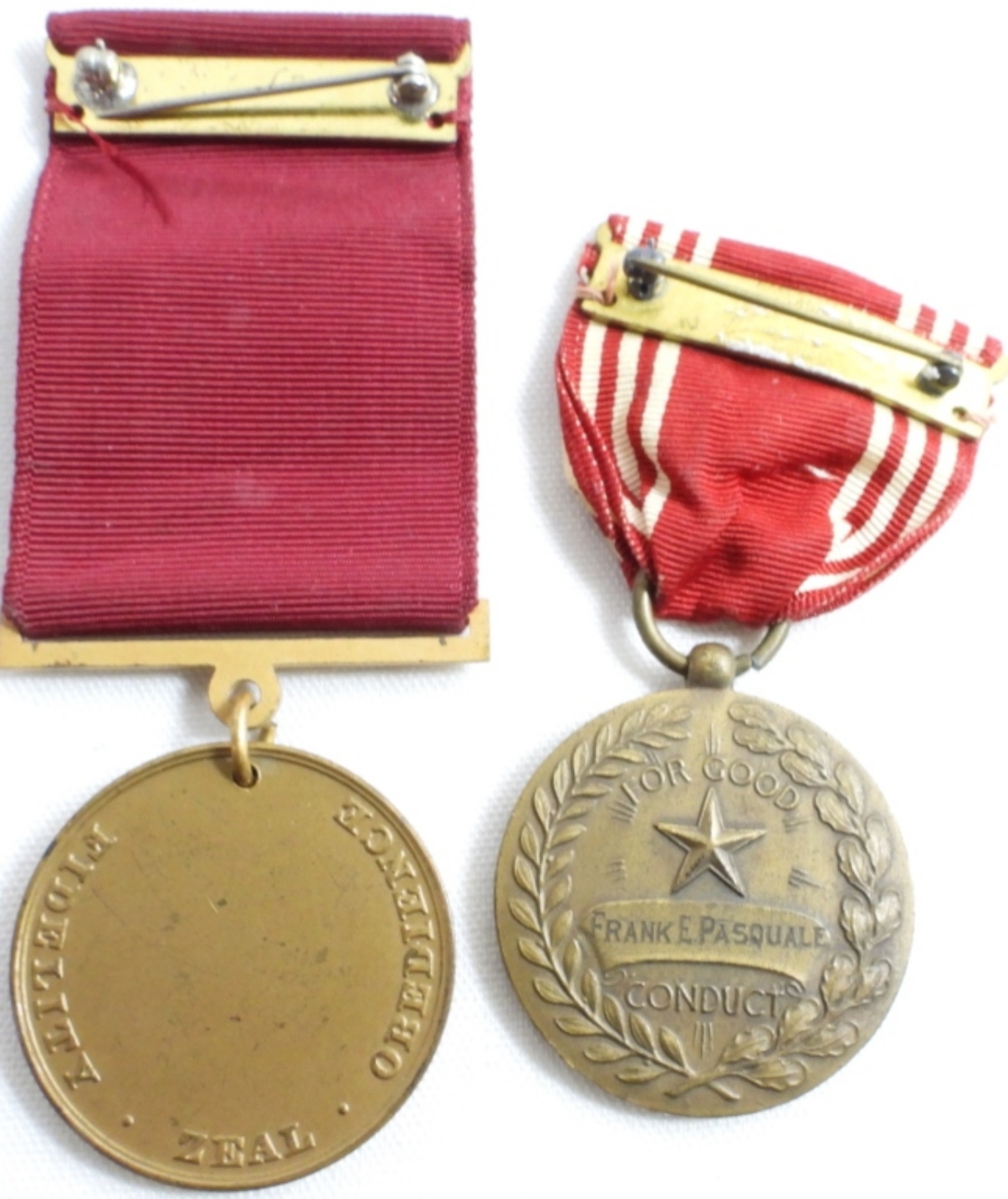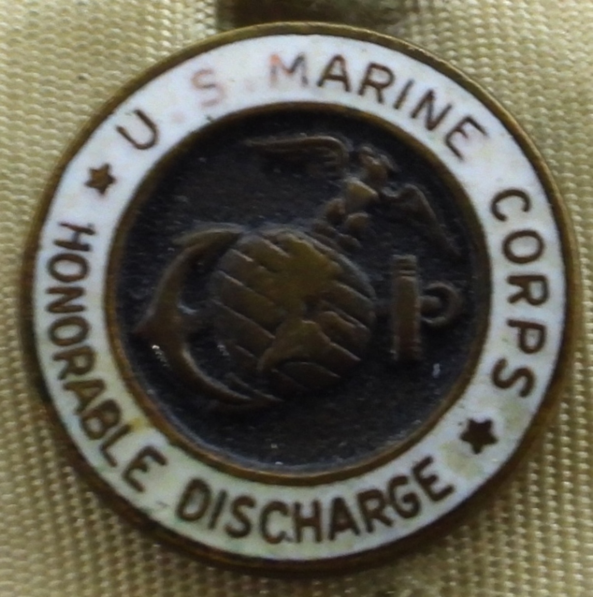 1) WWII Era Homefront Lapel/Pin. 2) U.S. Navy Anchor Pin. 3) Marine Corps Honorable Discharge Pin. 4) U.S. Navy Fidelity Zeal Obedience Ribbon and Pin. 5) Efficiency Honor Fidelity Good Conduct Ribbon and Pin.