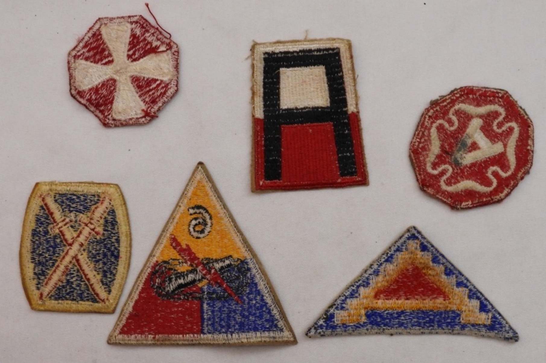 6 U.S. Army Patches, some of which include a WWII & Post 10th Light Infantry Division patch, and more.