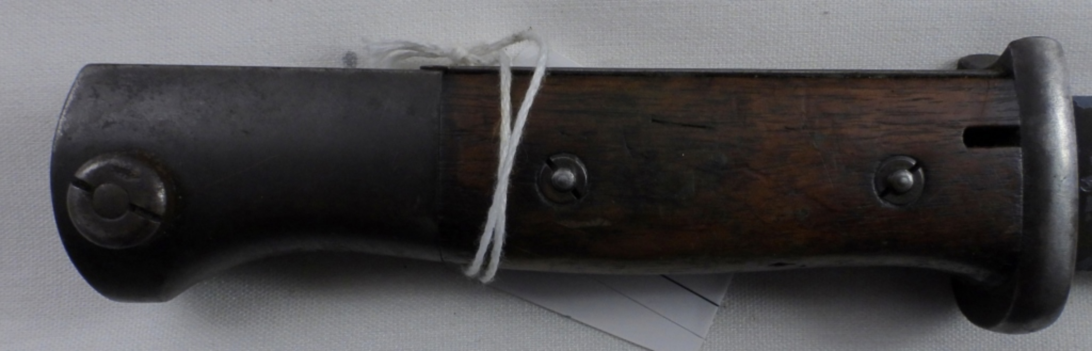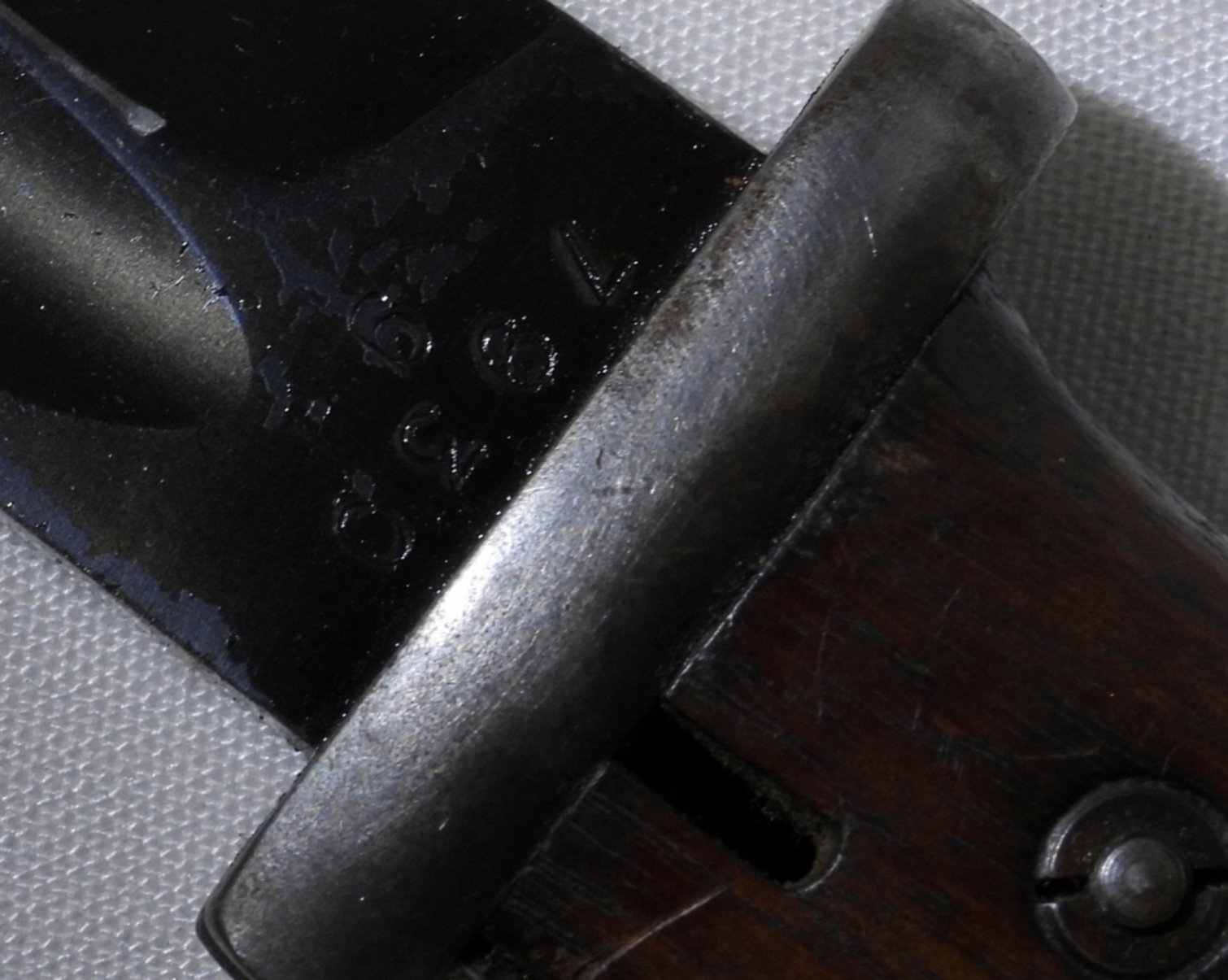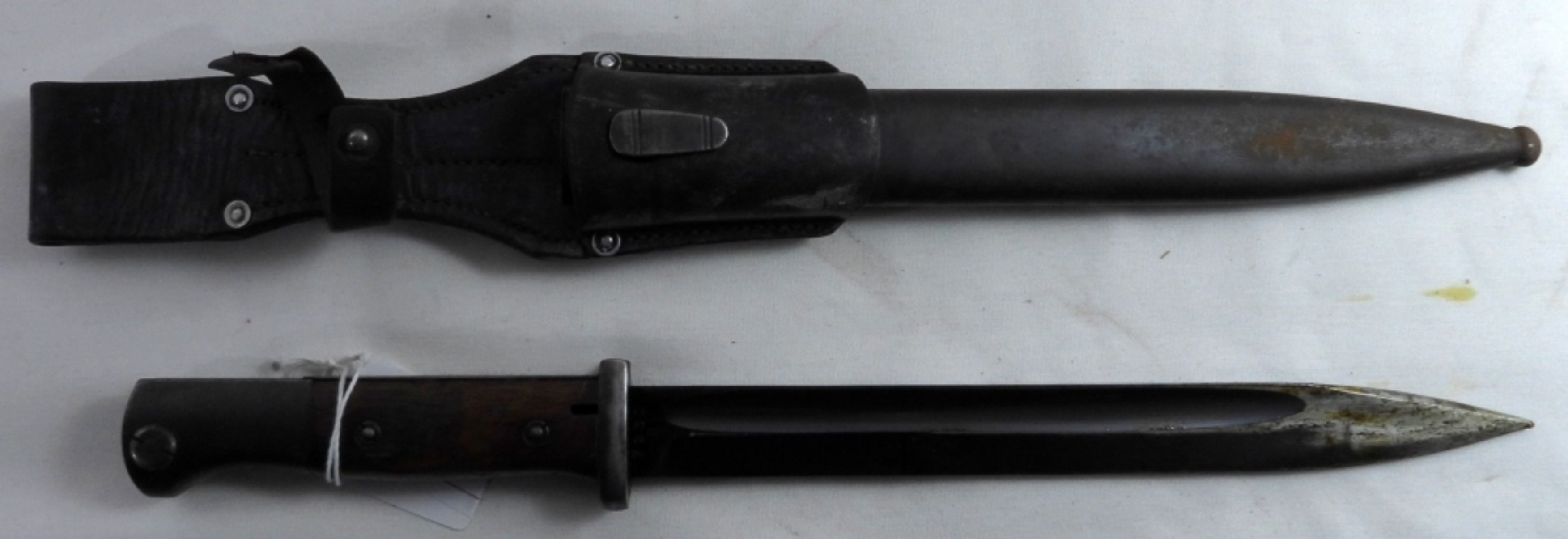 WWII bayonet with scabbard, there is a residue inside the scabbard, makes the blade stick, blade length 10″, Max Ficker & Sons Remise 1939, scabbard is missing top of snap