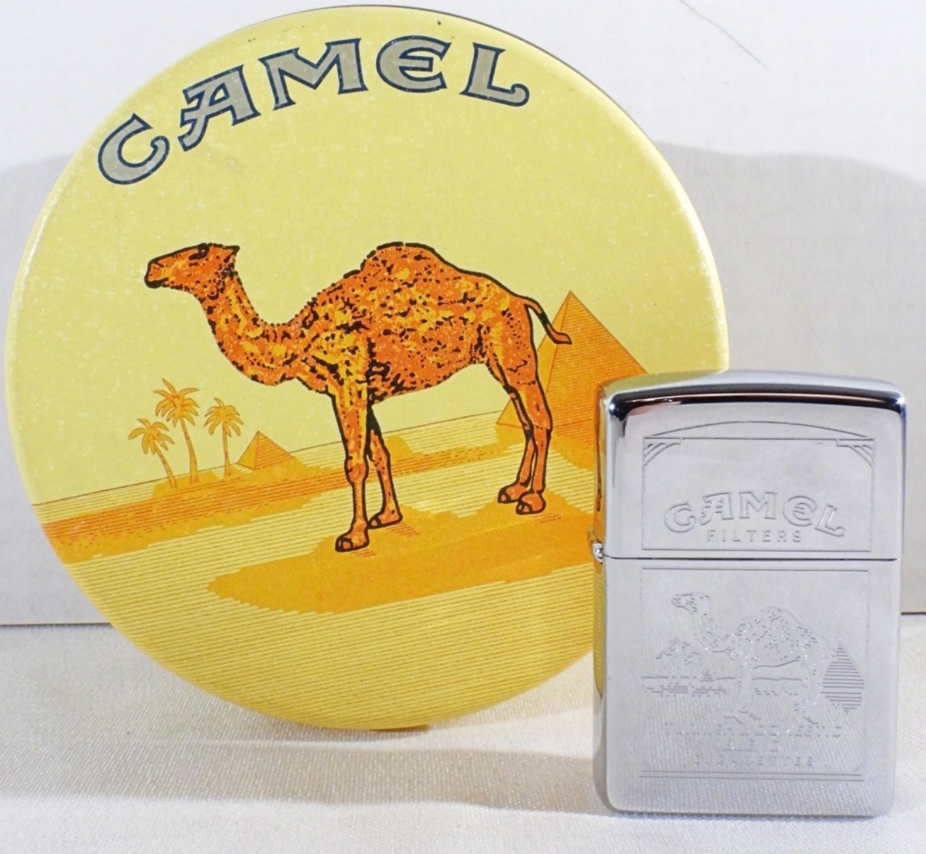 Comes in its original tin case. Camel Filters Turkish & Domestic Blend logo etched on both sides of the lighter. Sealed 1995