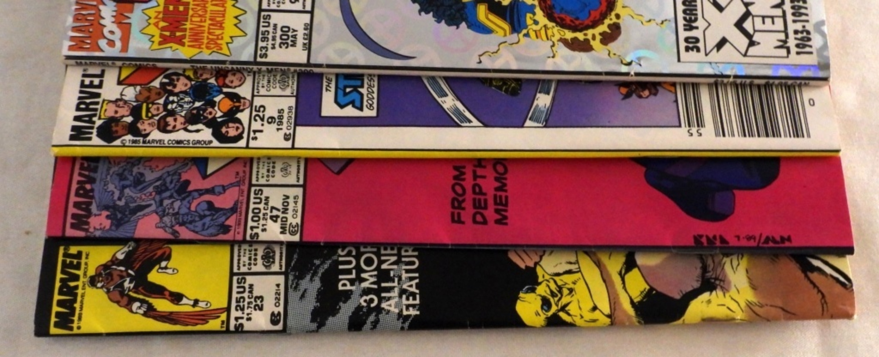 1) Marvel Comics Presents Cyclops of X-Factor Number 23, 1989, 2) X Factor Number 47, 1989, 3) Giant-Sized Annual X-Men Number 9, 1985, 4) X-Men 300, 1993