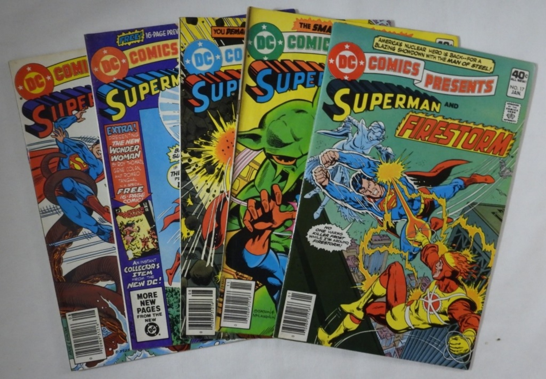 Various Grades and Years: 1979 Superman and The Atom #15, 1980 Superman and Firestorm #17, 1980 Superman and Deadman #24, 1981 Superman and The Joker #41, and 1982 Superman and Aquaman #48
