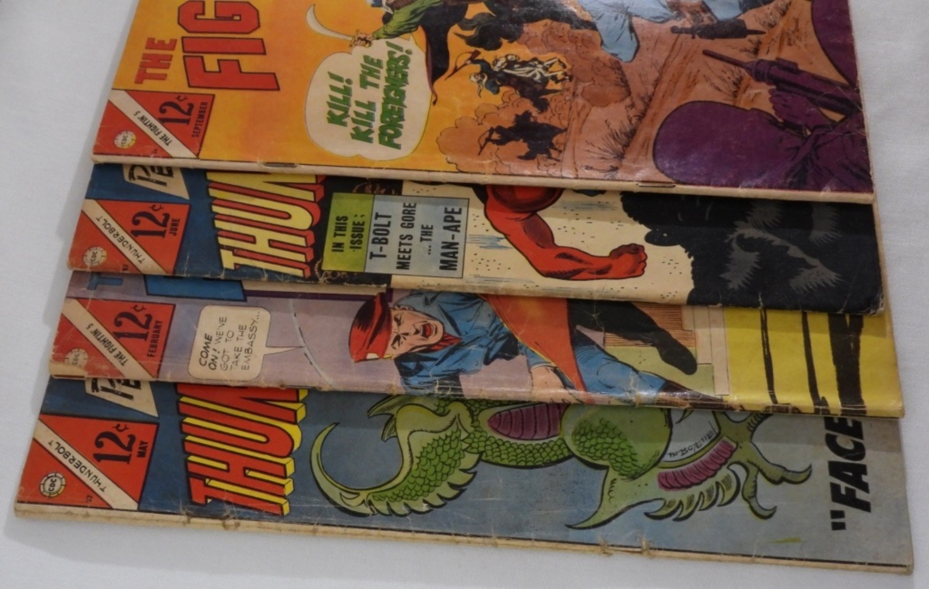 4 Charlton comic books, which include The Fightin’ 5 “Death Rode The Red Wind”, Peter Cannon Thunderbolt ” Face of the Dragon”, and more. All in various conditions. One has a marking on it and has a torn page as shown in