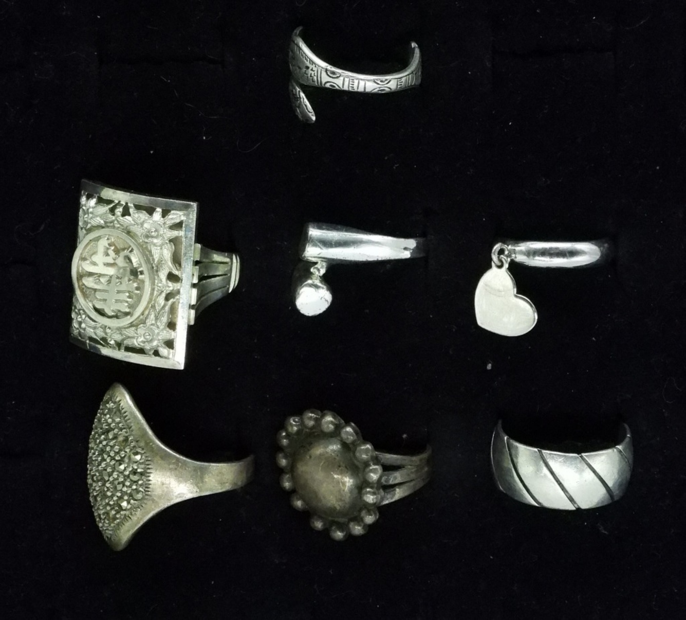 Seven sterling fashion rings. Sizes 5-10 (25.5 dwt)