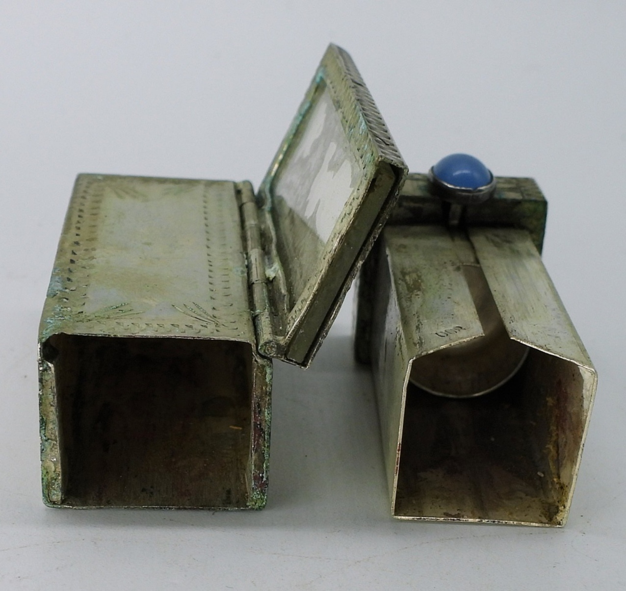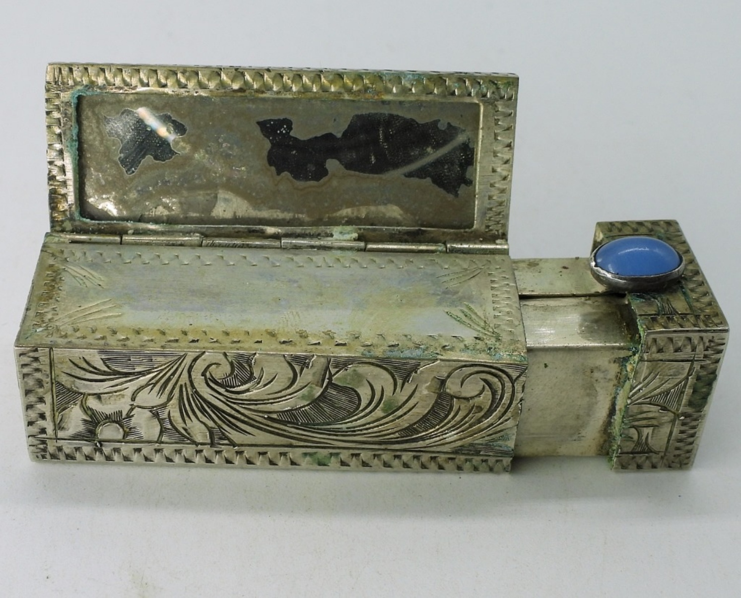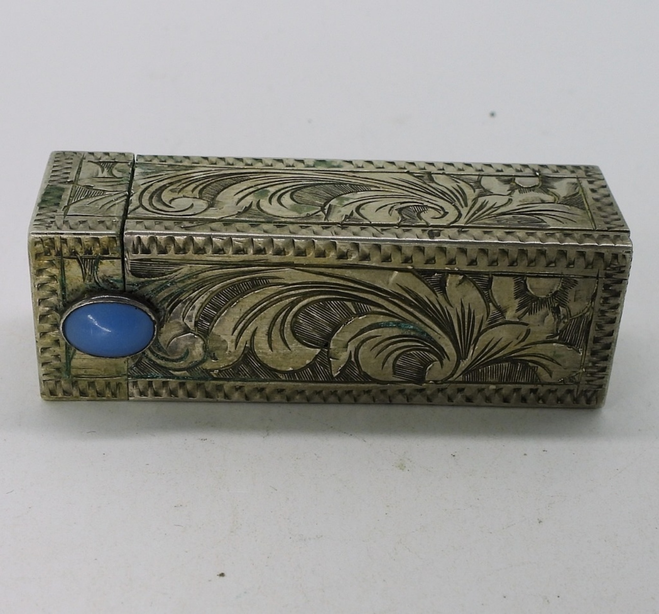 Vintage sterling lipstick compact with blue gemstone. 2″ tall, 1″ wide. (17 dwt)