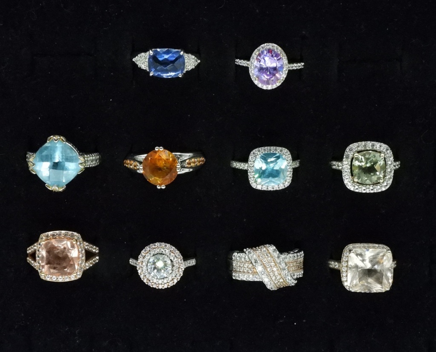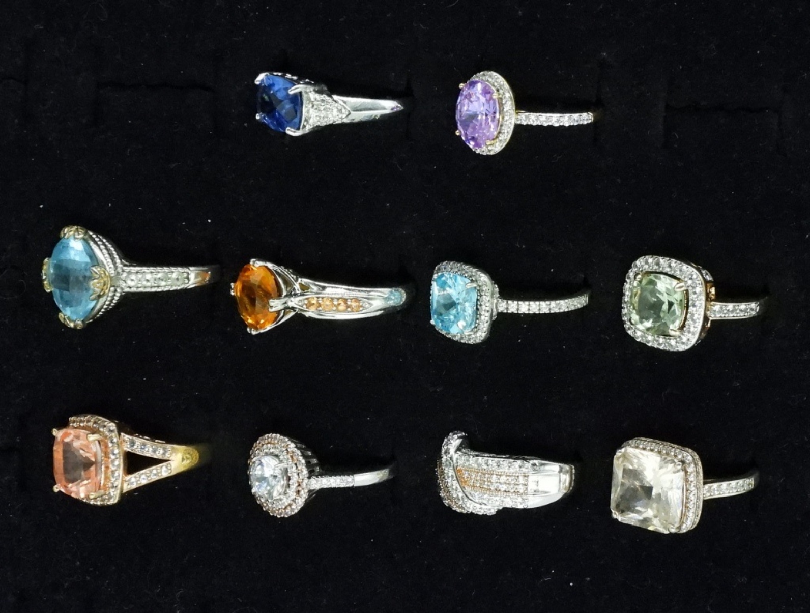 Ten gold and silver tone, sterling rings with gorgeous gemstones. Amethyst, Blue Topaz, simulated diamond, simulated topaz. (28 dwt)