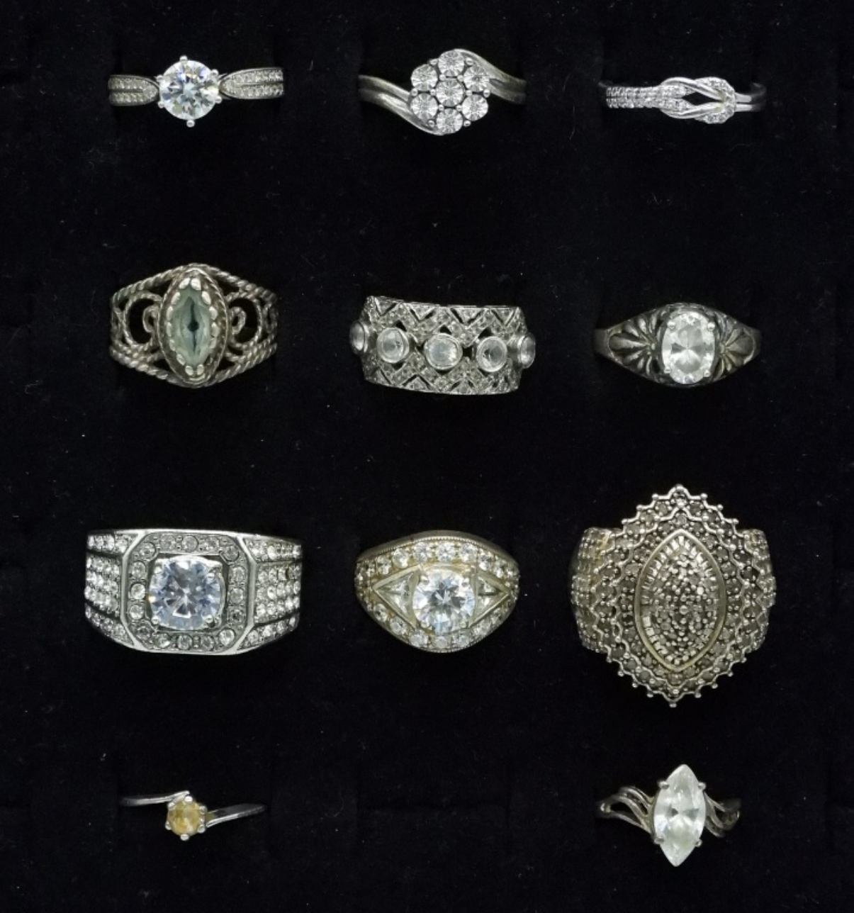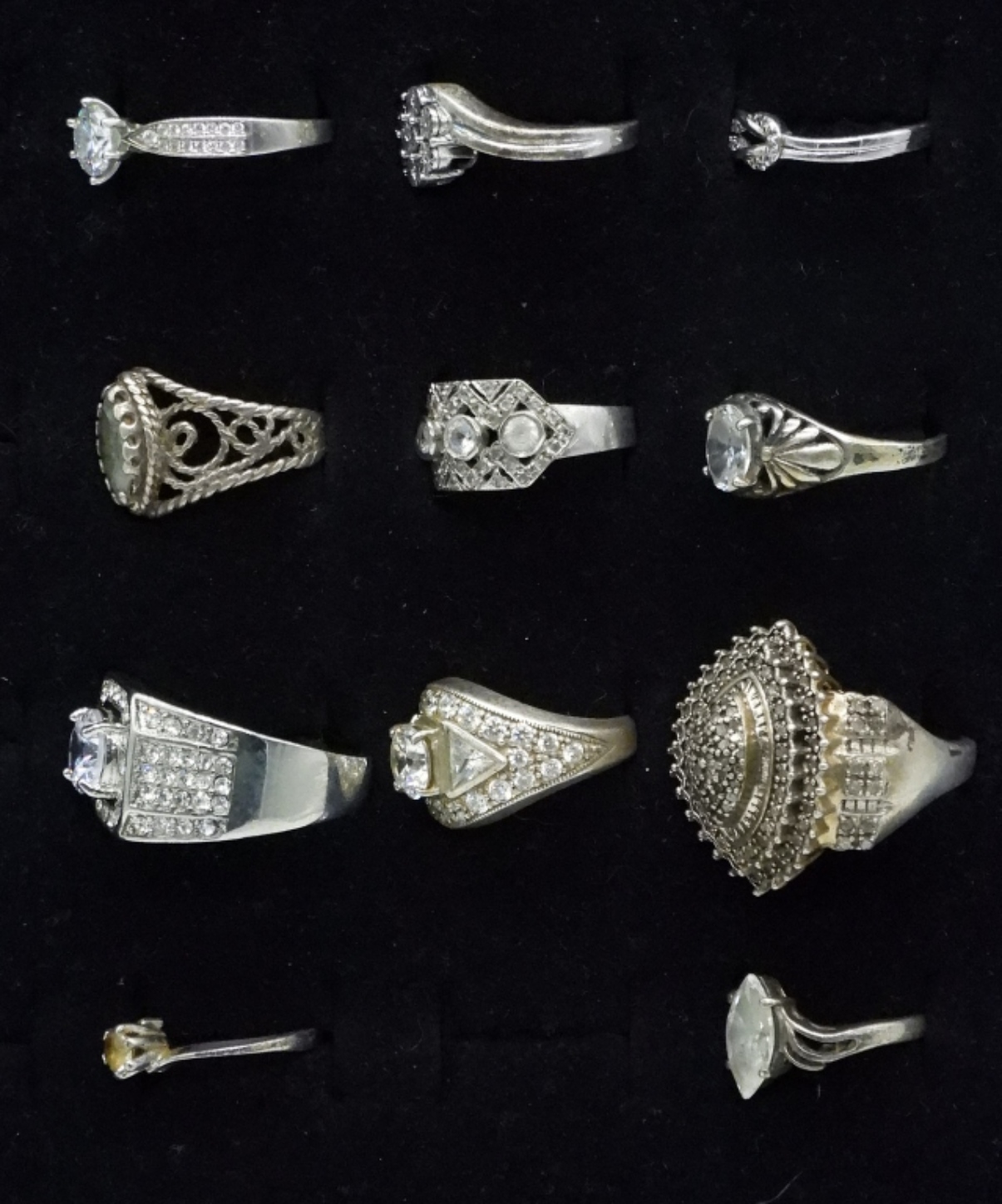 Eleven sterling rings, simulated diamonds. Sizes 5-12 (31 dwt)