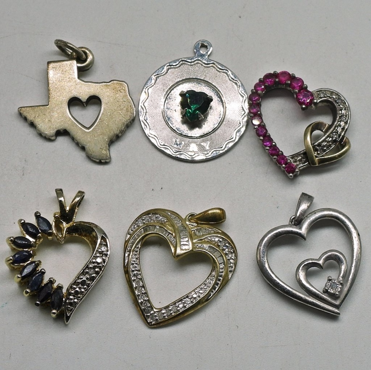 Eight sterling heart shaped pendants. Two sterling 18″ chains. (15.8 dwt)