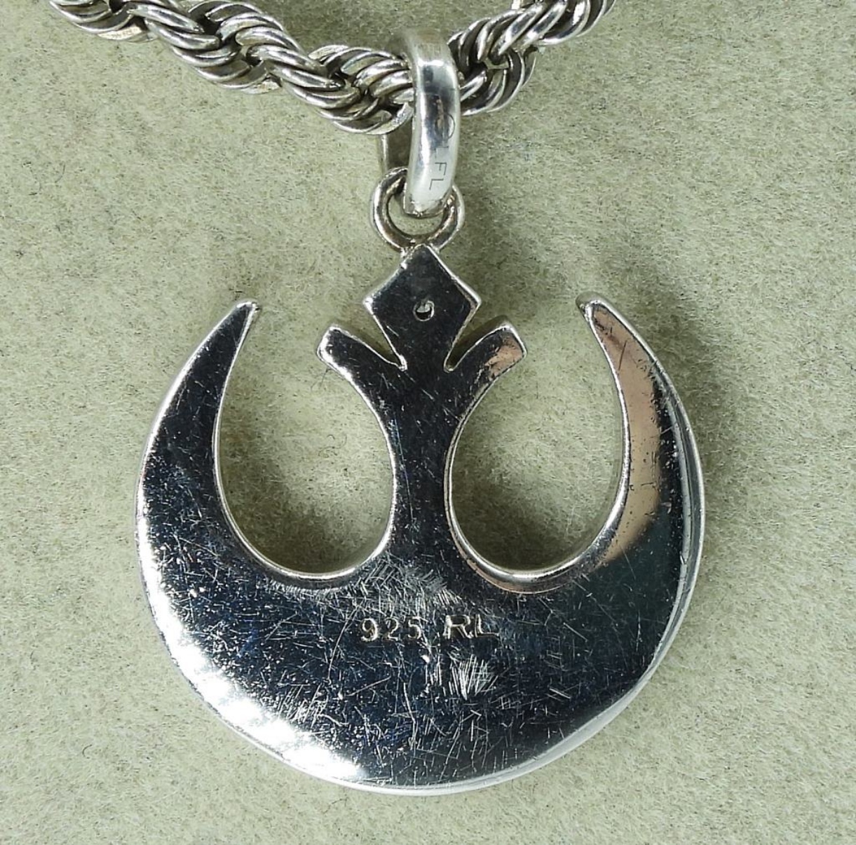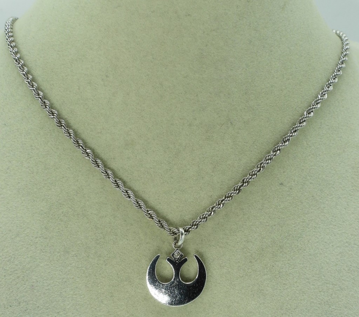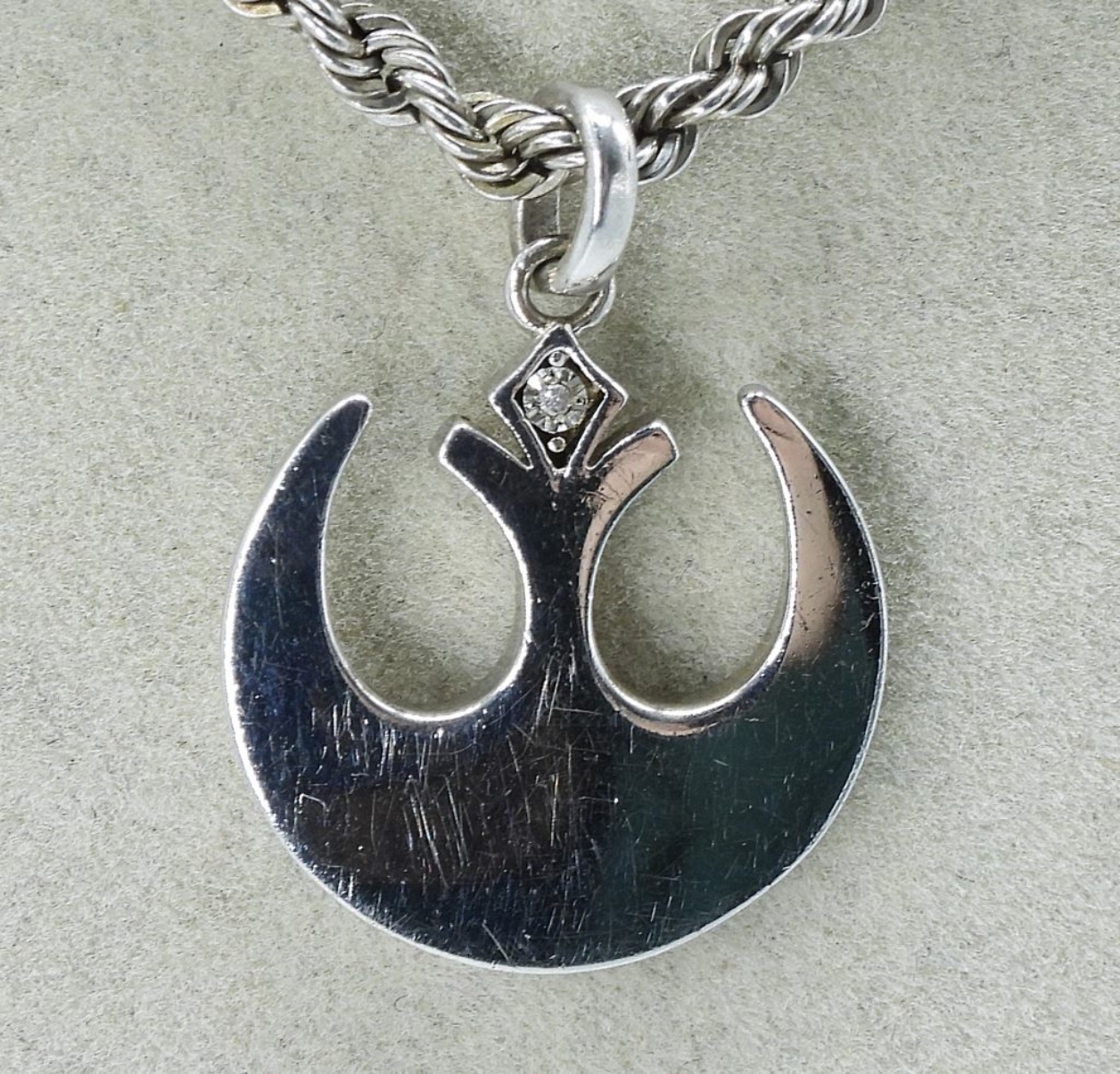 Star Wars, rebel alliance sterling necklace with tiny diamond (tested). Sterling chain is 22″ long. (10.1 dwt)