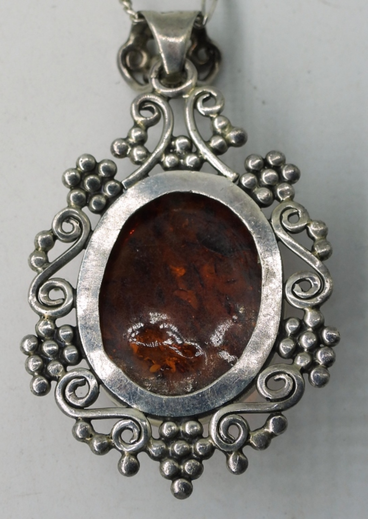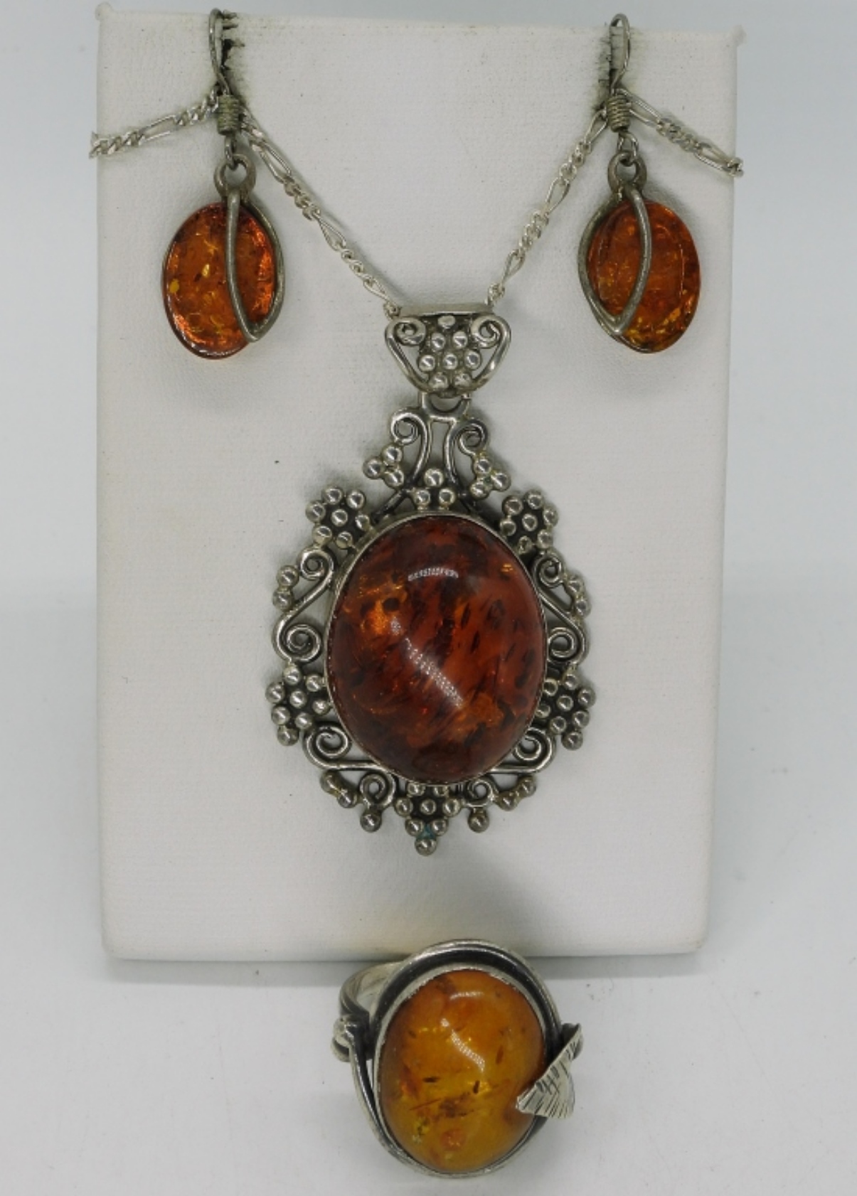 Amber necklace is 22″. Amber ring, size 6.5 & pierced amber earrings. (15 dwt)