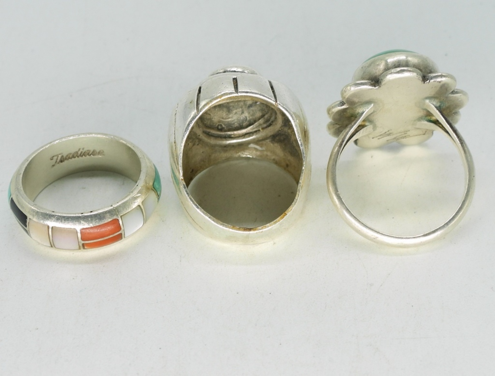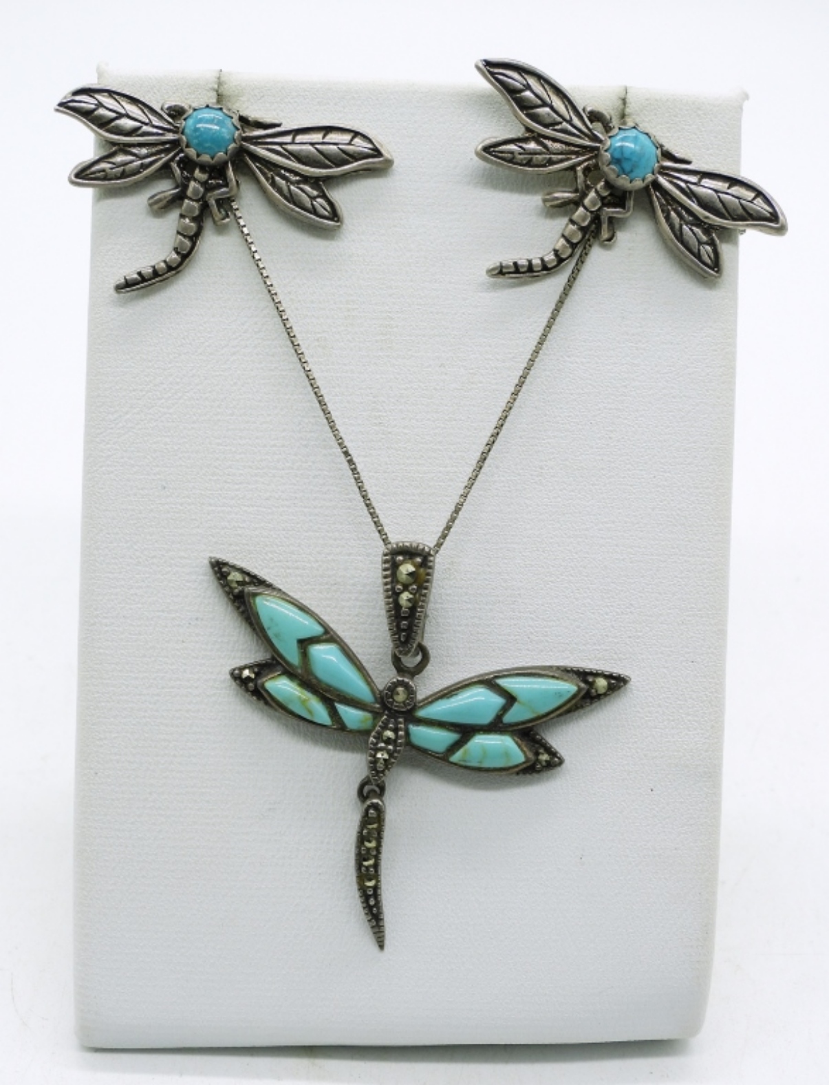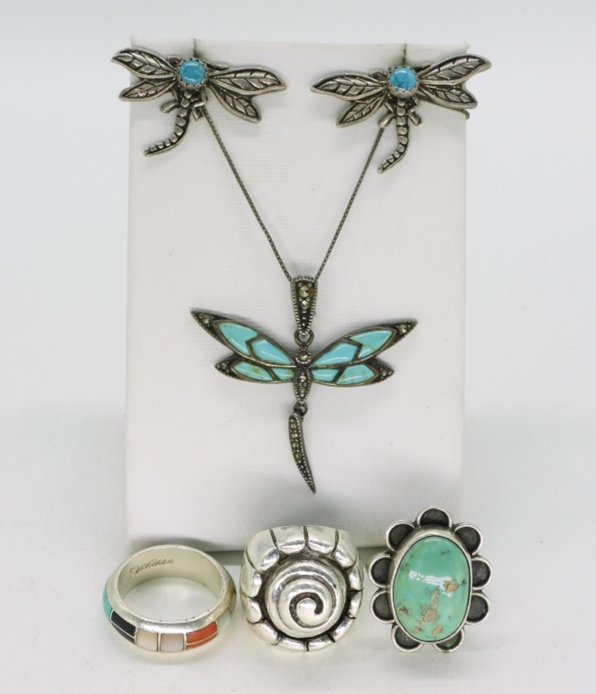 Turquoise Dragonfly Necklace & Matching Pierced Earrings. Necklace is 18″ long. Three gorgeous rings, turquoise and inlaid mother of pearl, turquoise, black onyx. Ring sizes 5, 6, 8. (23 dwt)