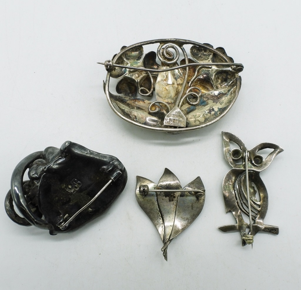 Four vintage sterling brooches, 1.5″ – 2.5″. (27 dwt)