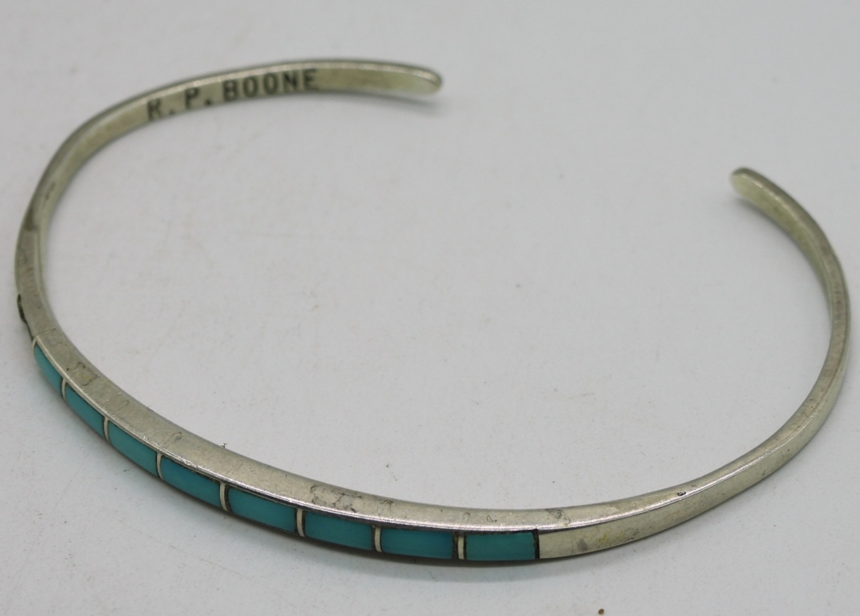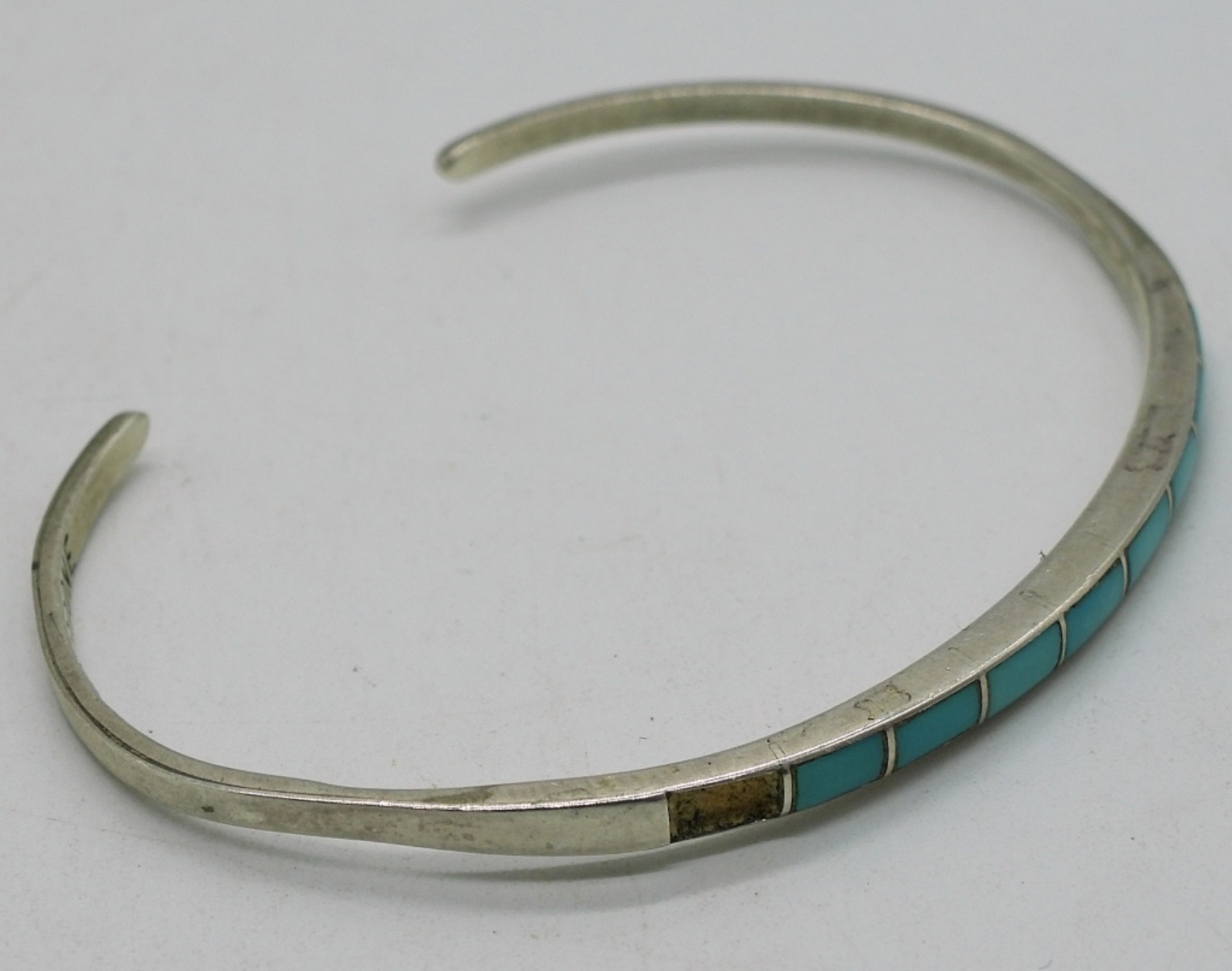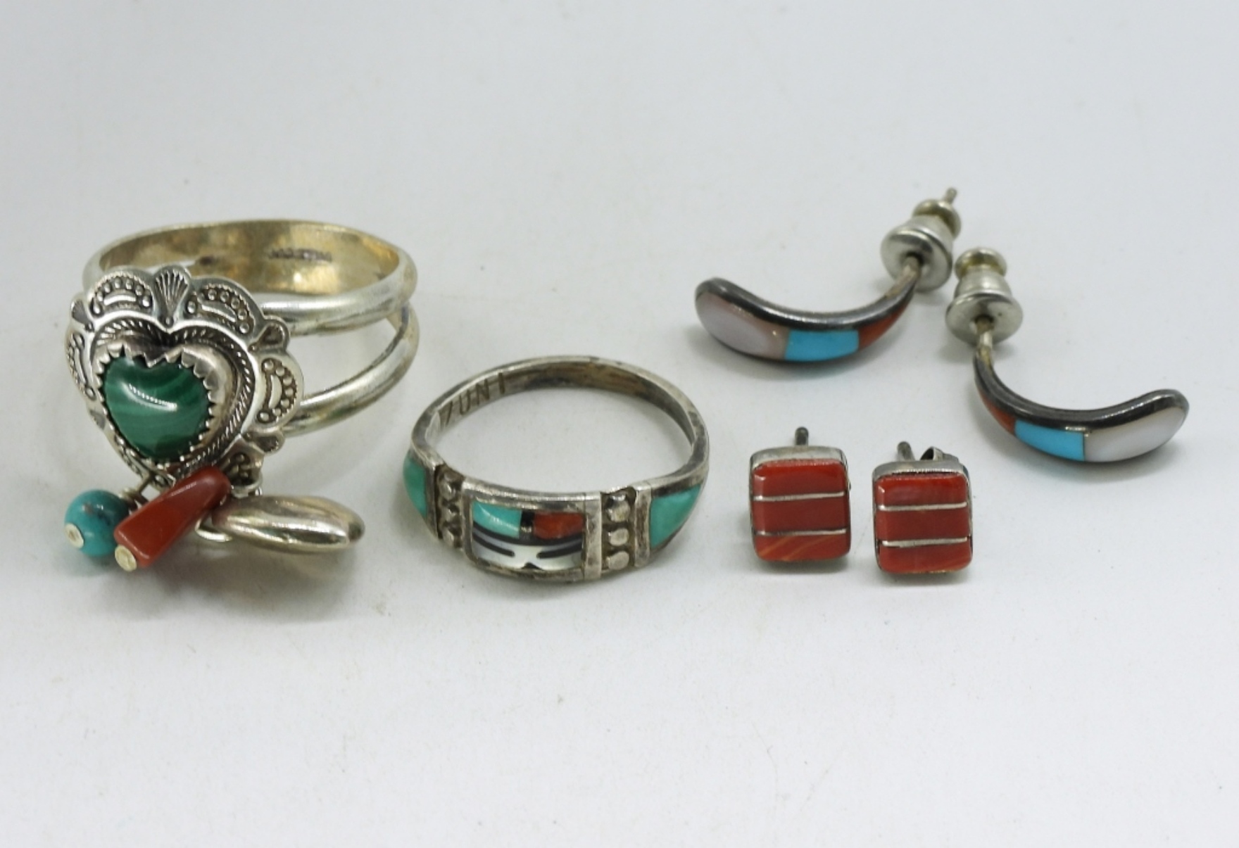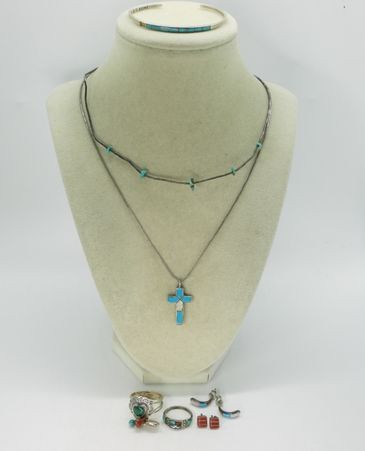 Two sterling necklaces, 16-18″. Turquoise cuff bracelet, missing one stone. Two pair of pierced earrings. Two rings, sizes 6 & 9. (16.6 dwt)