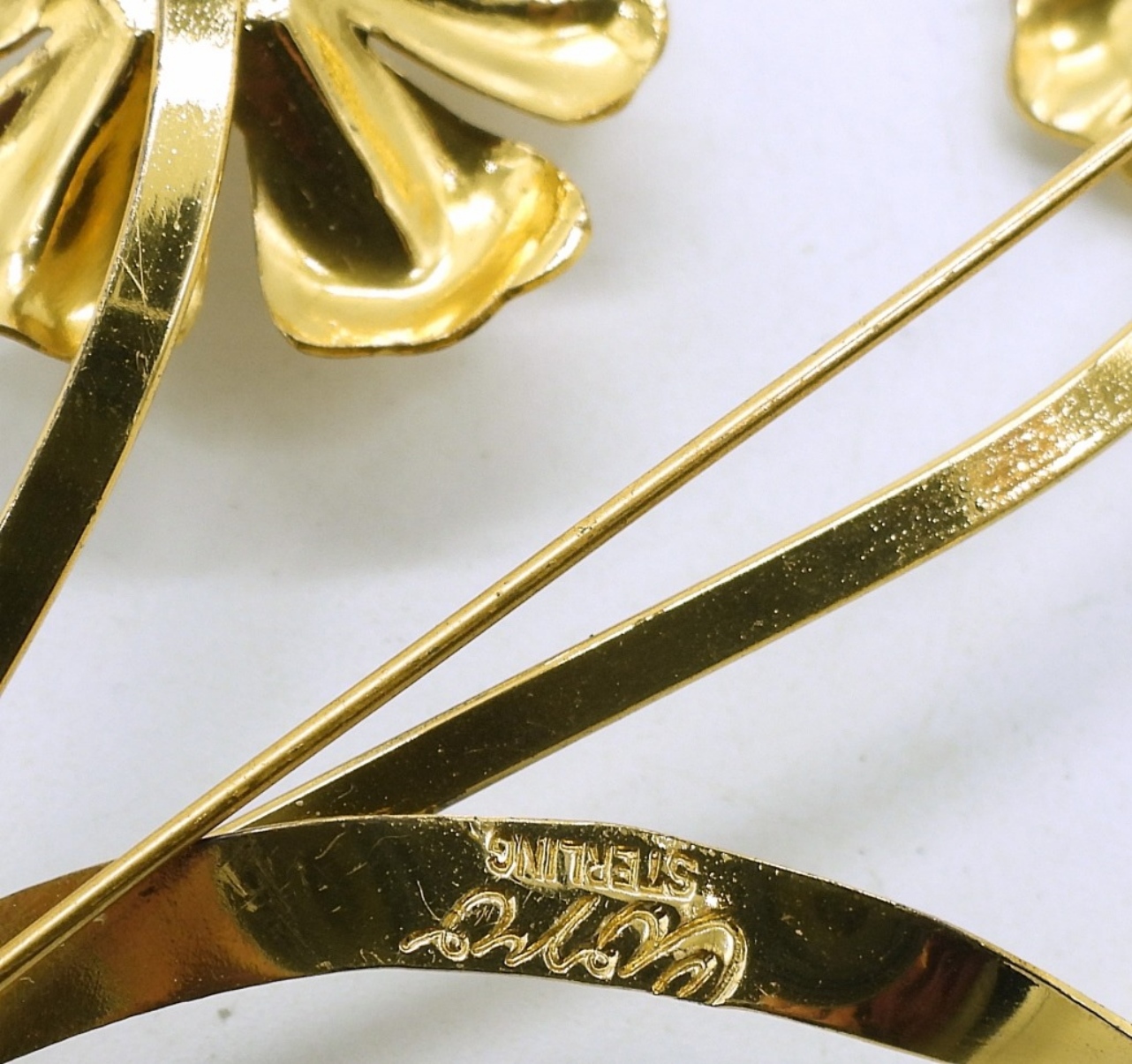Gold tone sterling Cor brooch with pink gemstones, 4.5″ long. Two faux diamond sterling, gold tone bracelets7.5″. (27.7 dwt)