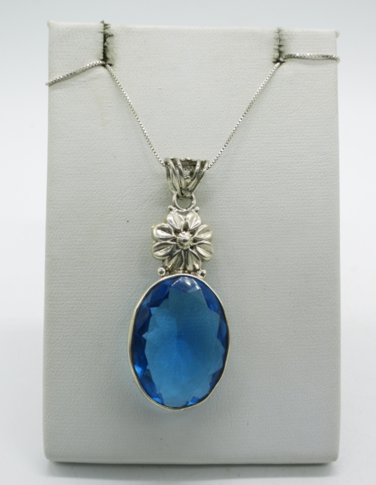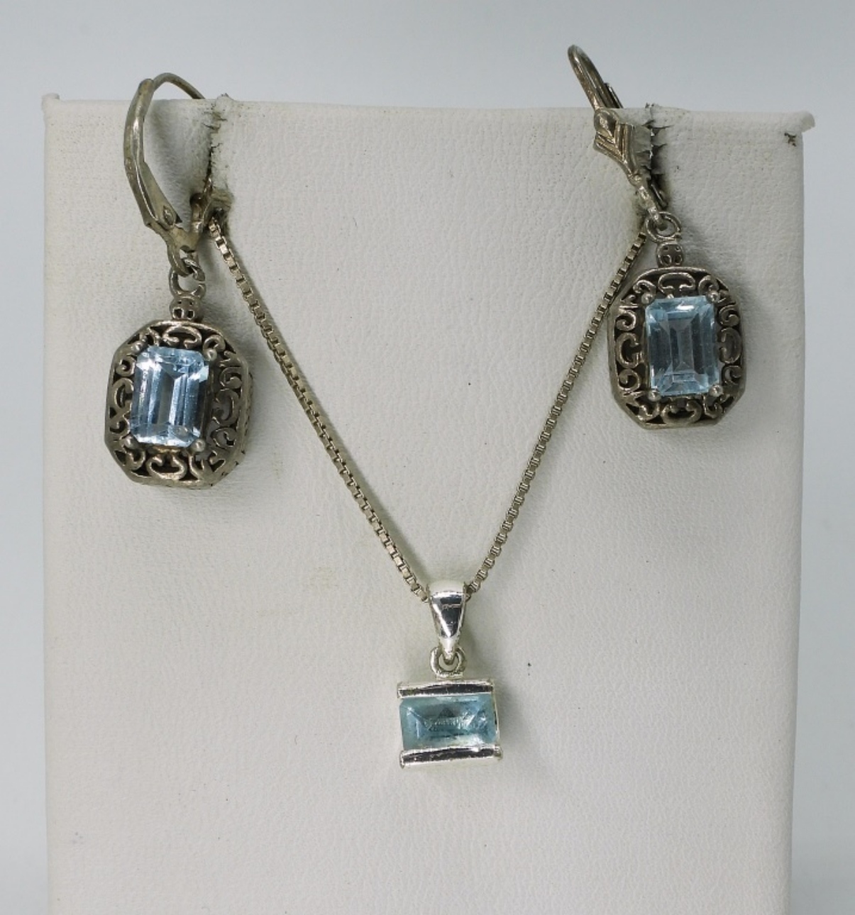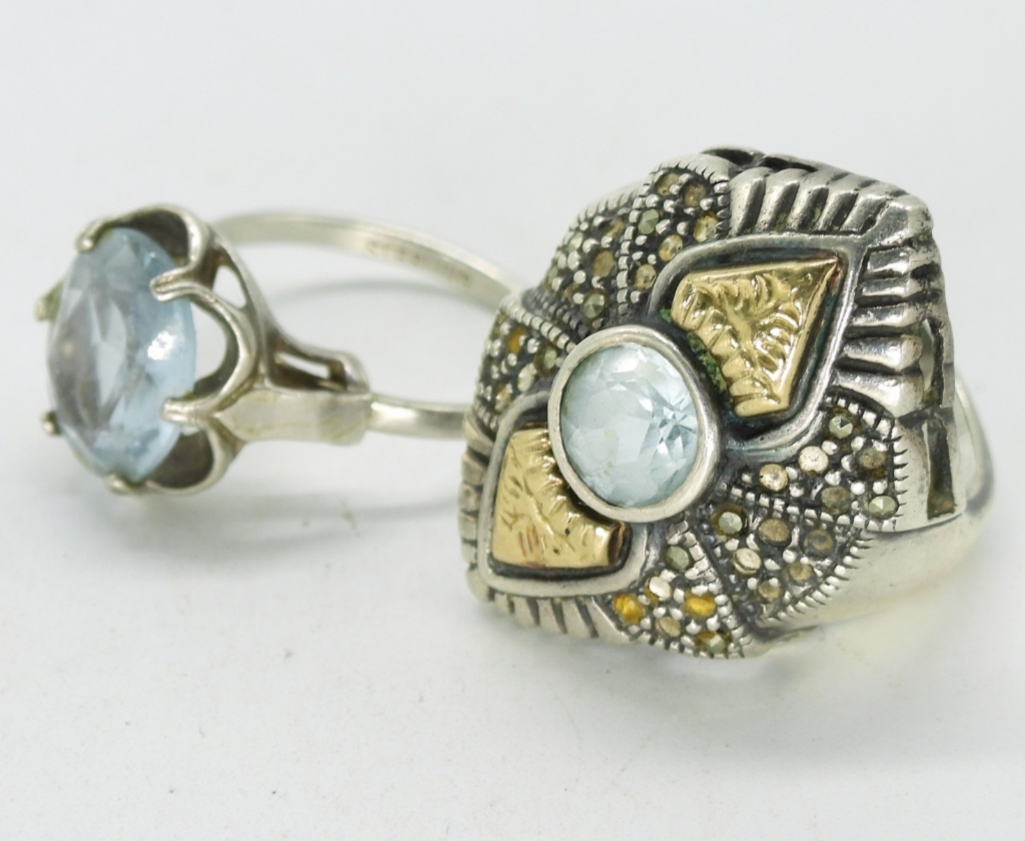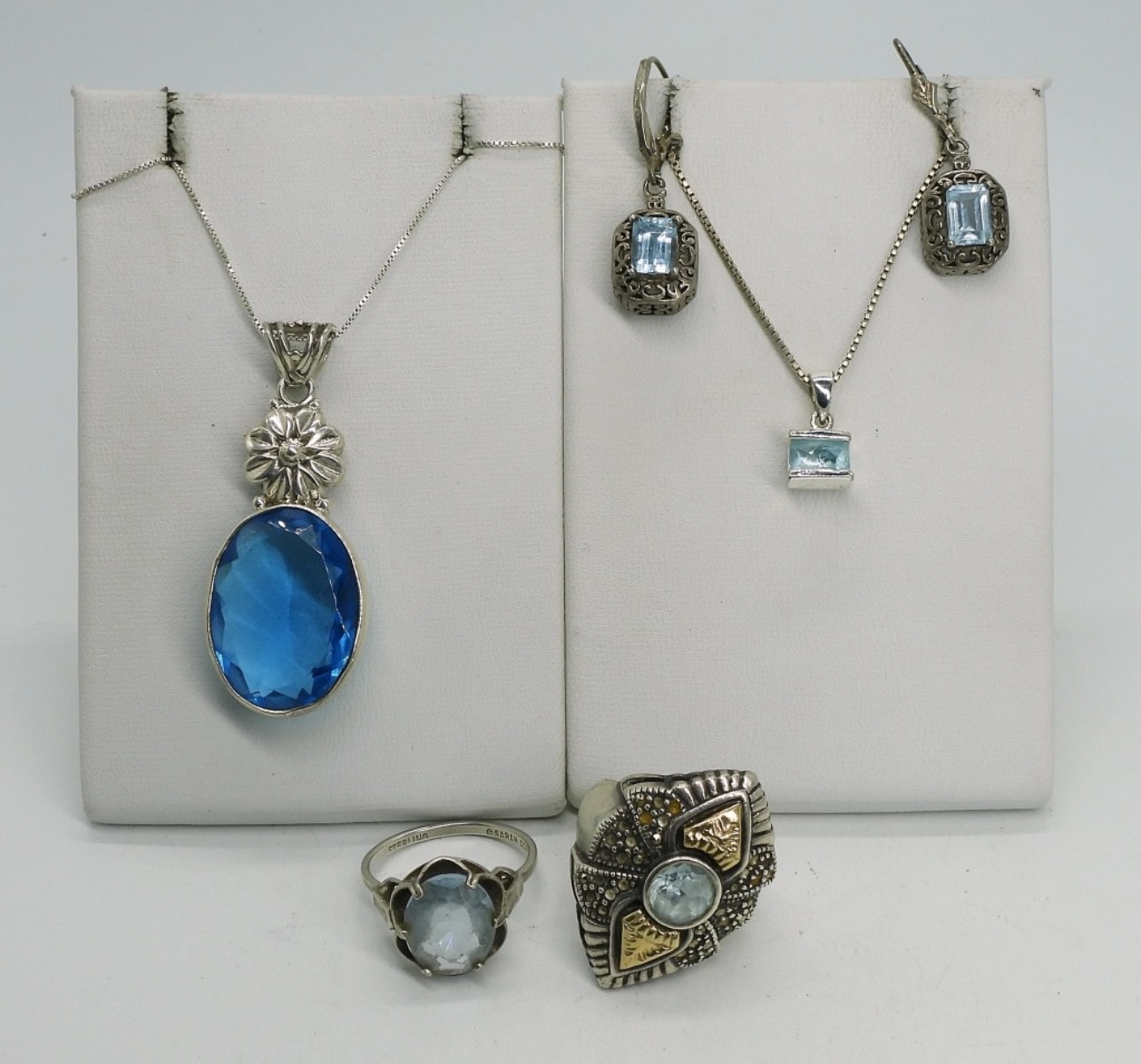 Two sterling rings, size 6.5-7. Two necklaces, 18-20″. Pierced earrings, 1.5″. (20 dwt)