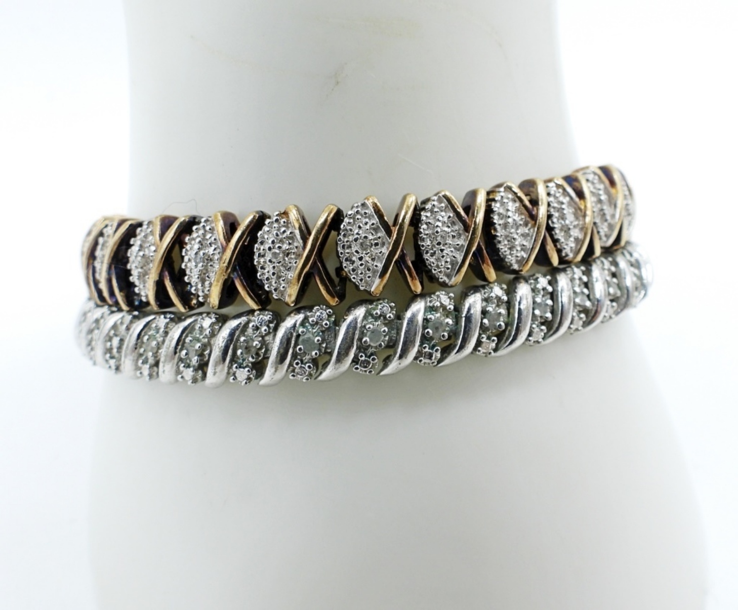Two sterling diamond bracelets, one gold tone. Both are 8″ long. (24.4 dwt)
