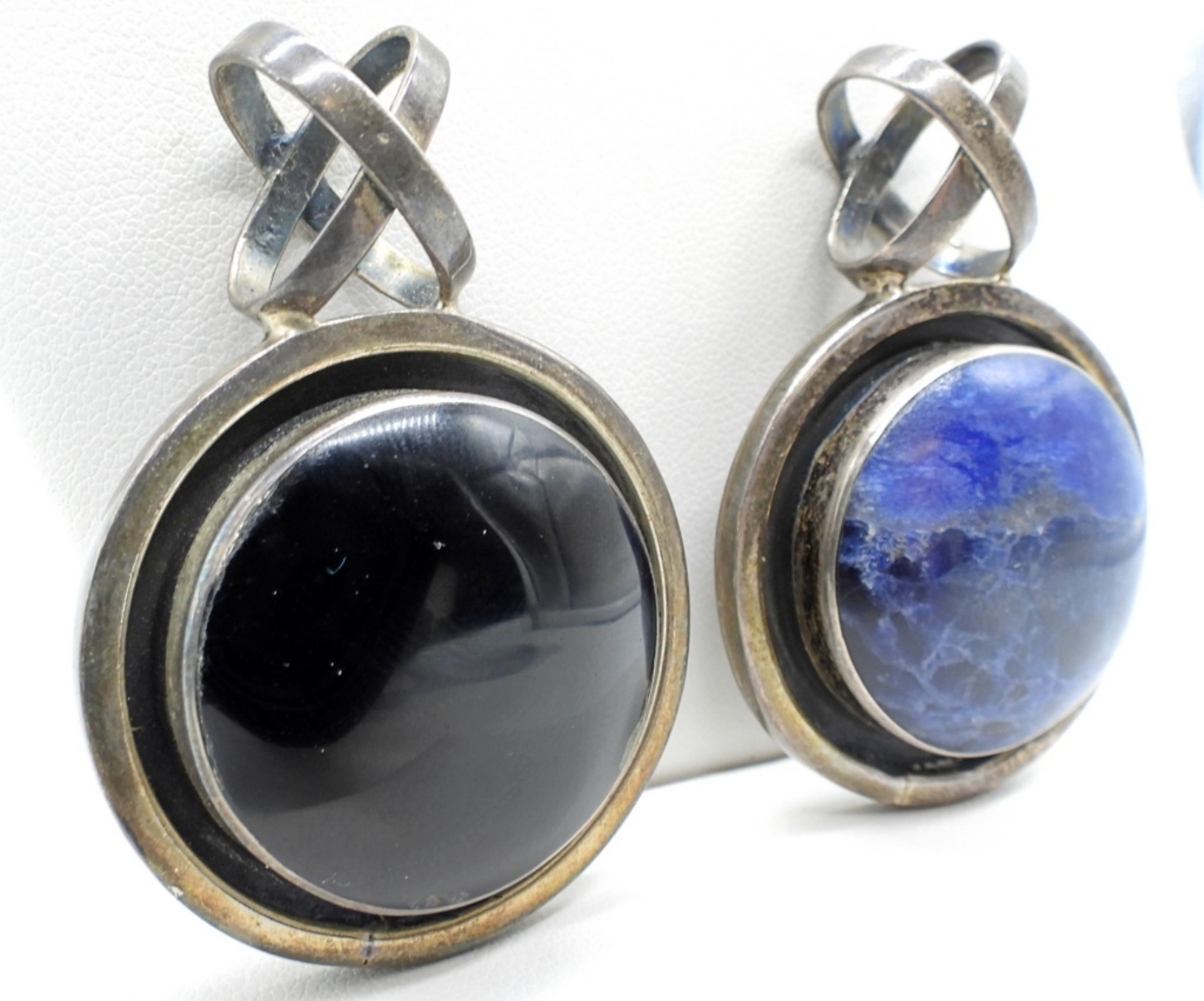 Two sterling Taxco pendants, Black Onyx and Sodalite gemstones. 2″ long. TC-315 (32.2 dwt)