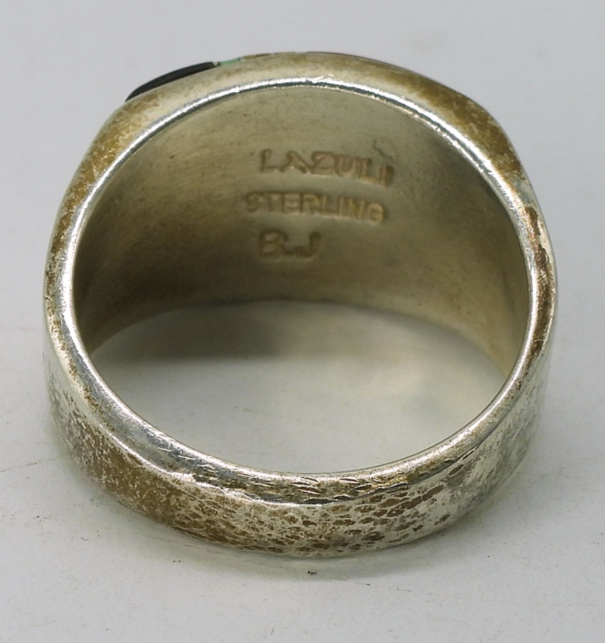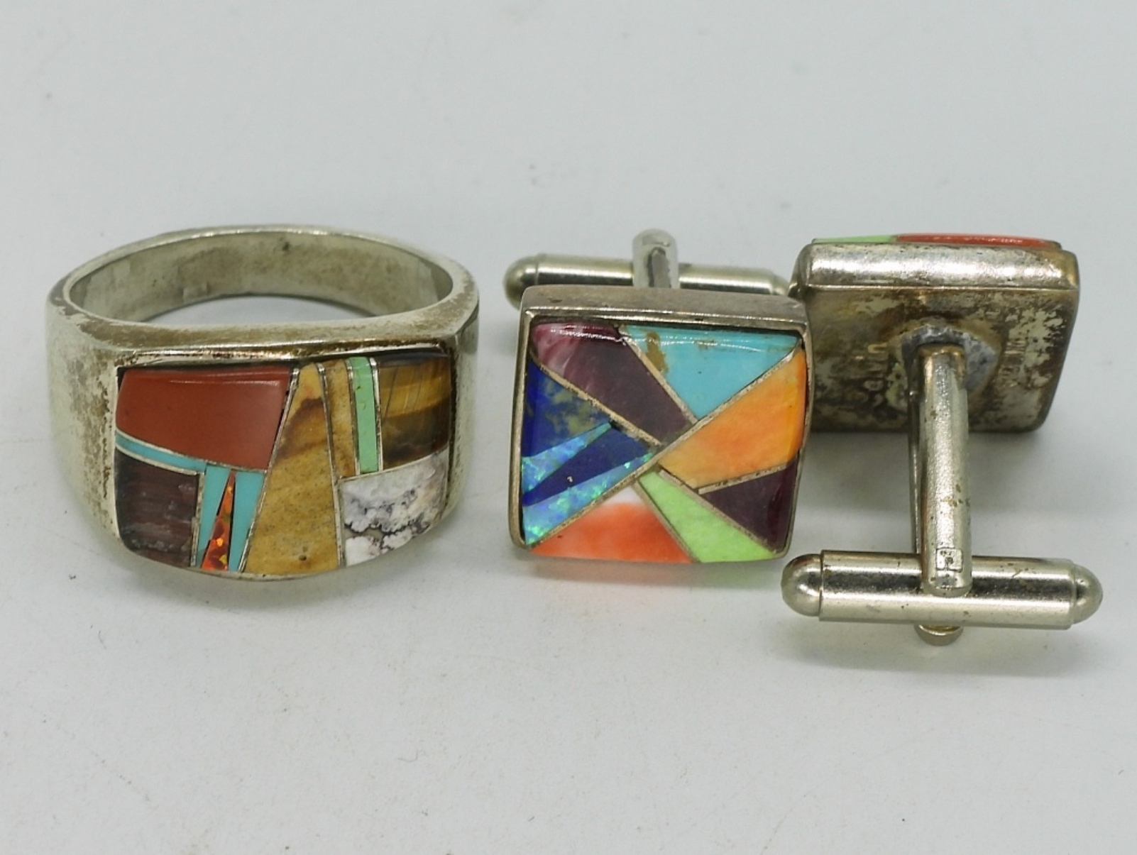 Sterling ring, size 12.5 with gorgeous inlaid gemstones. Sterling cufflinks with inlaid gemstones. (17.5 dwt)