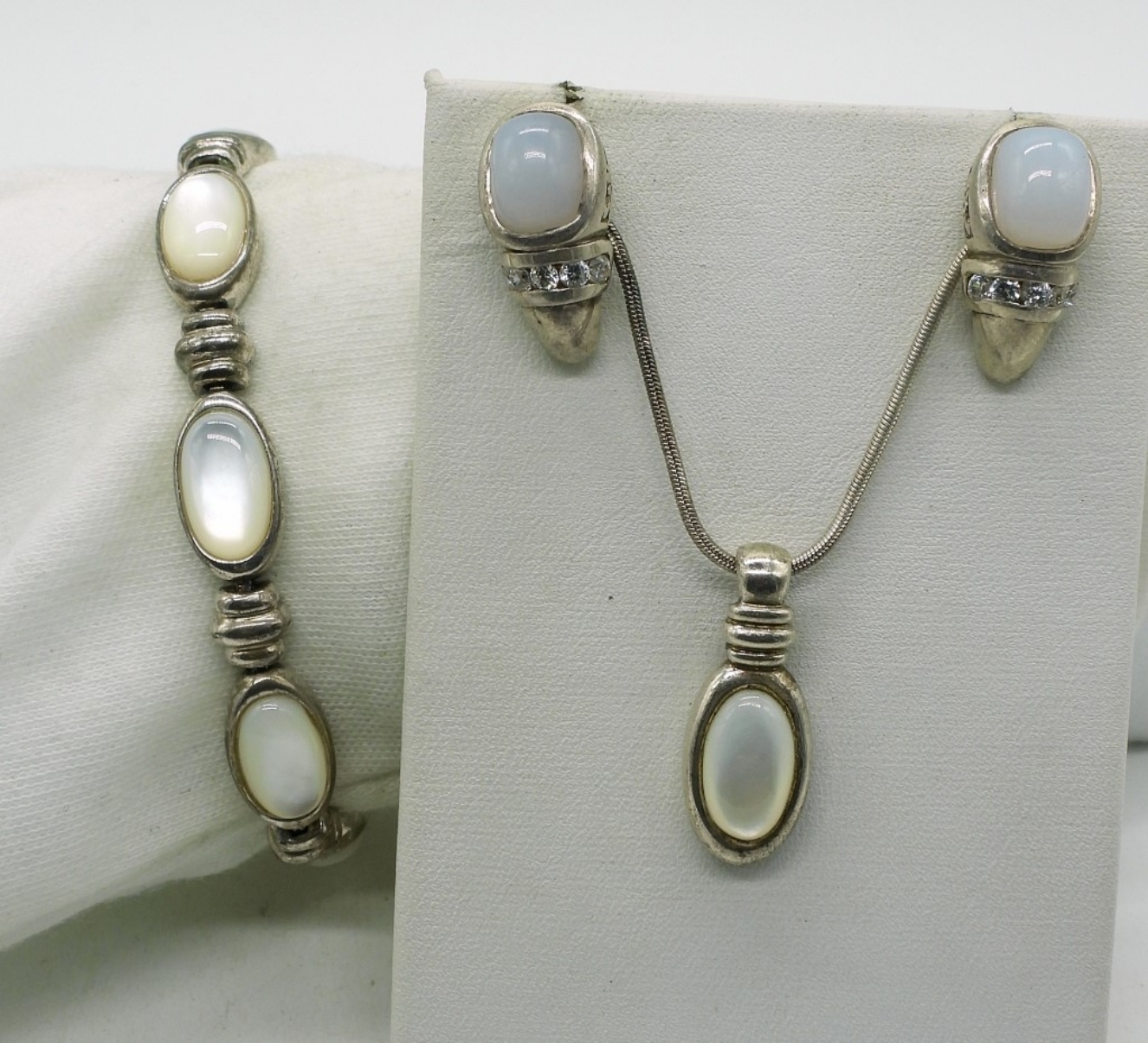 Sterling mother of pearl set, Necklace is 18″. Pierced earrings and 7.5″ bracelet. (20 dwt)