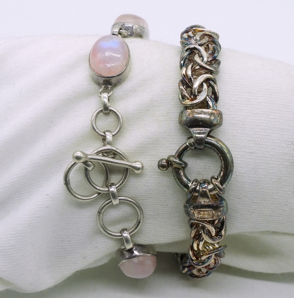 Two sterling bracelets. Moonstone with pink tinge. 7-8″. (19 dwt)
