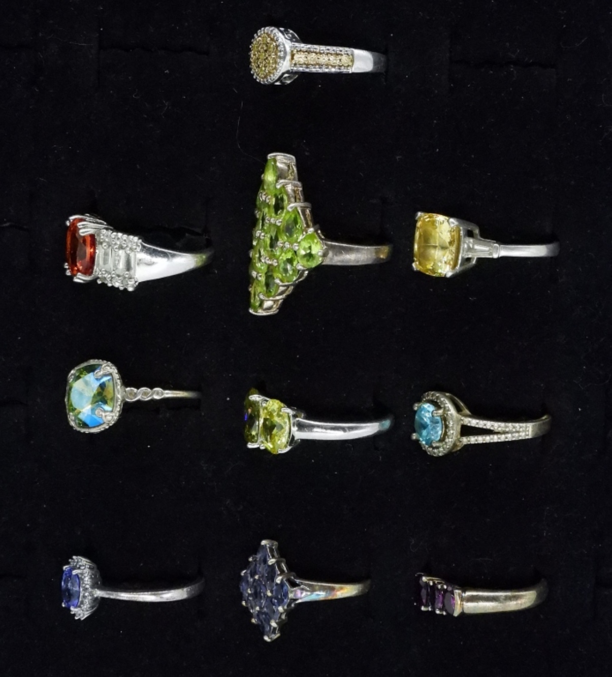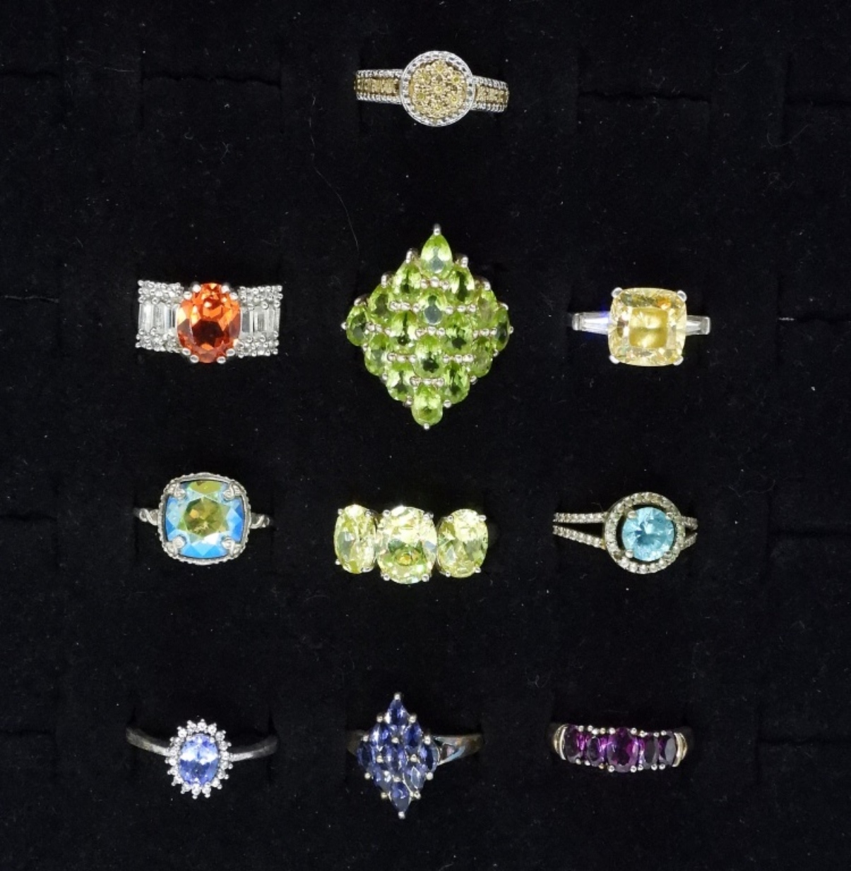 Ten sterling fashion gemstone rings, sizes 6-8 (24 dwt)