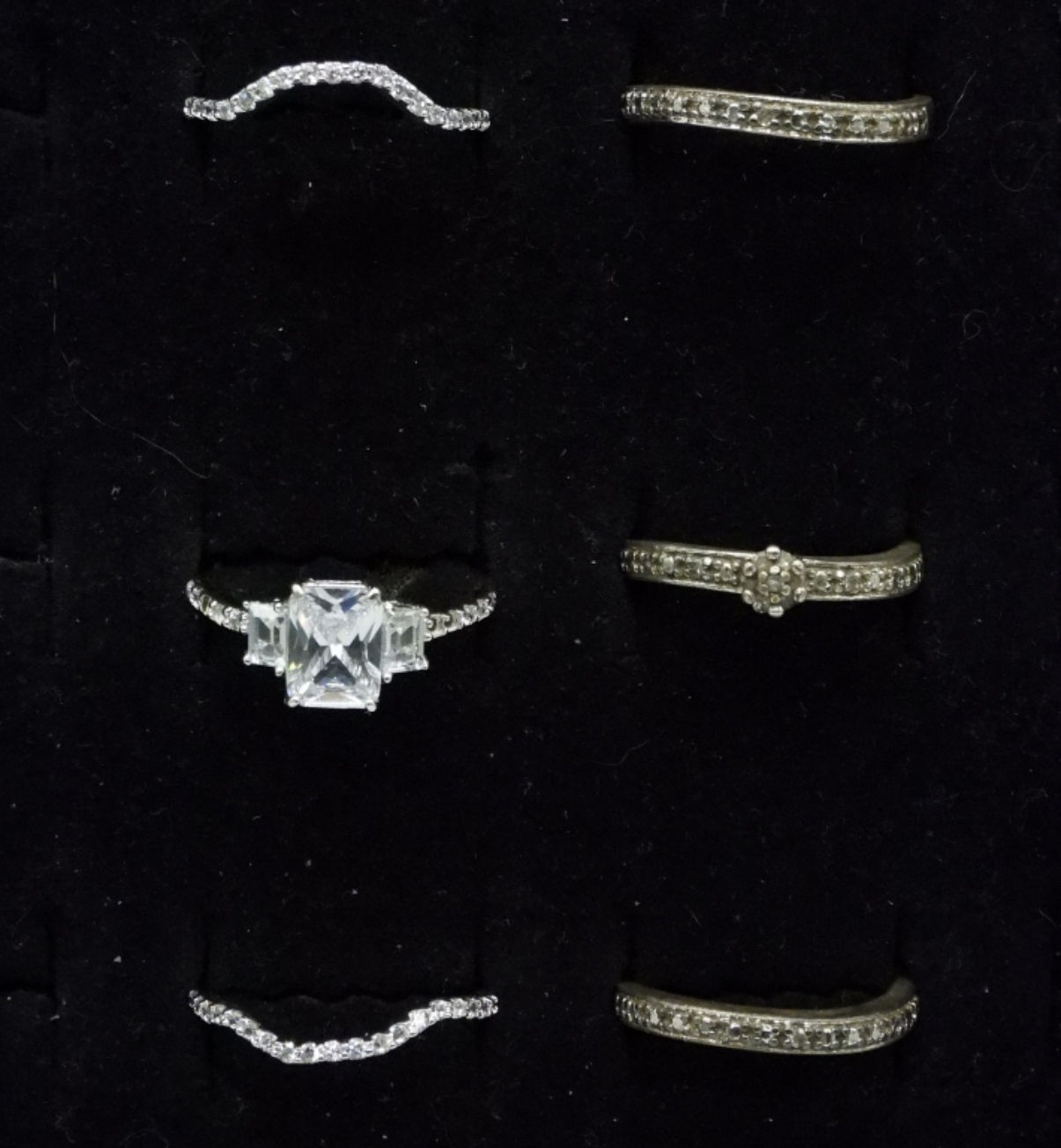 Thirteen sterling bridal style rings, simulated diamonds. Two full ring sets. Sizes 4-7. Large heart ring is Judith Ripka. (20 dwt)