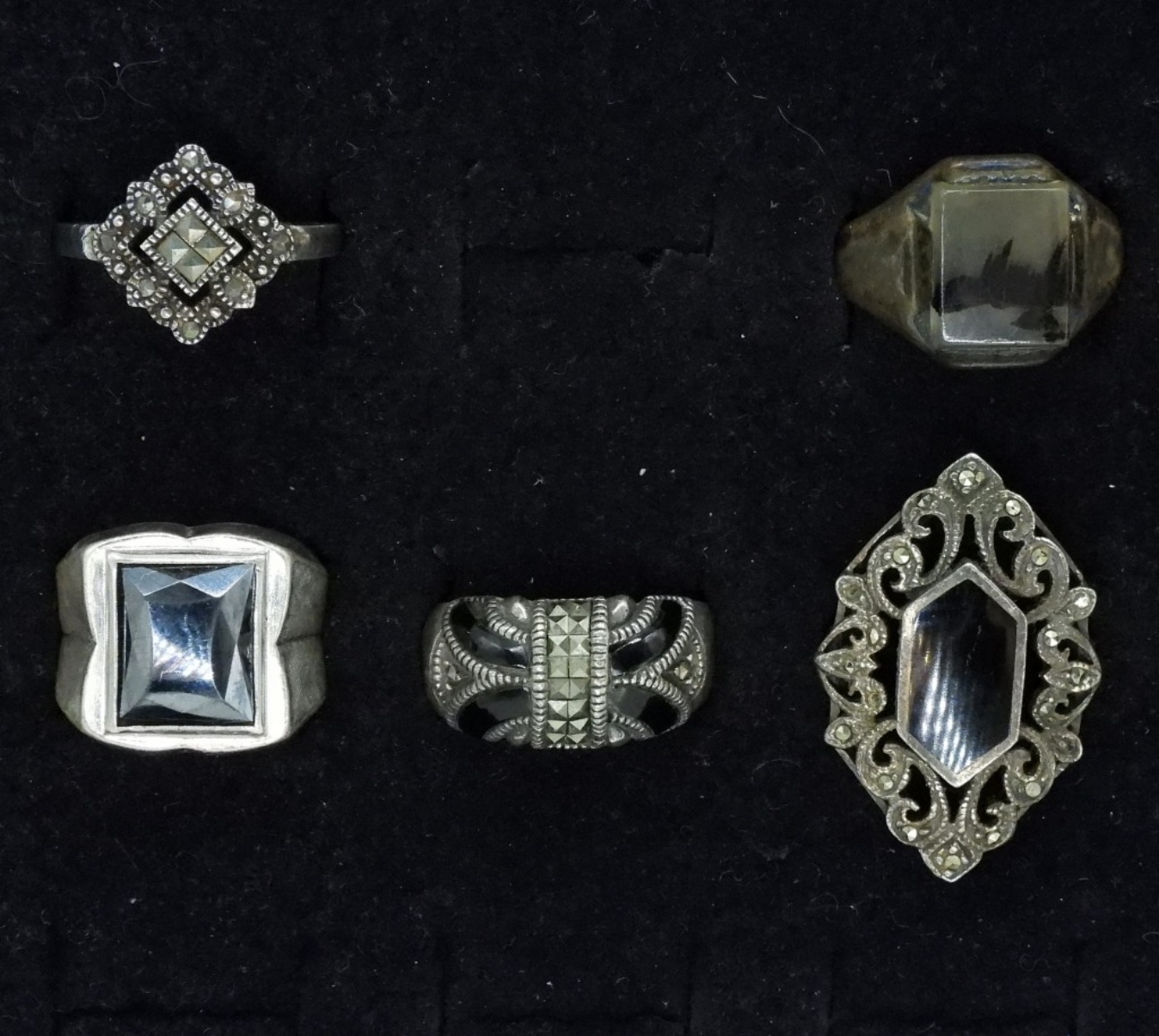 Five sterling marcasite onyx rings, sizes 6-9 (20 dwt)