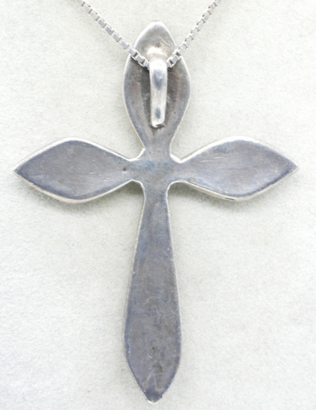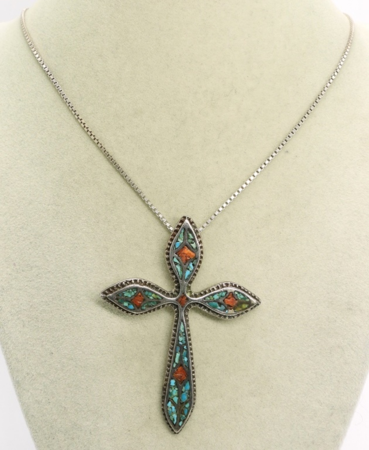 Inlaid Turquoise sterling cross pendant. 3″ long. Chain is 24″ long. (17.4 dwt)