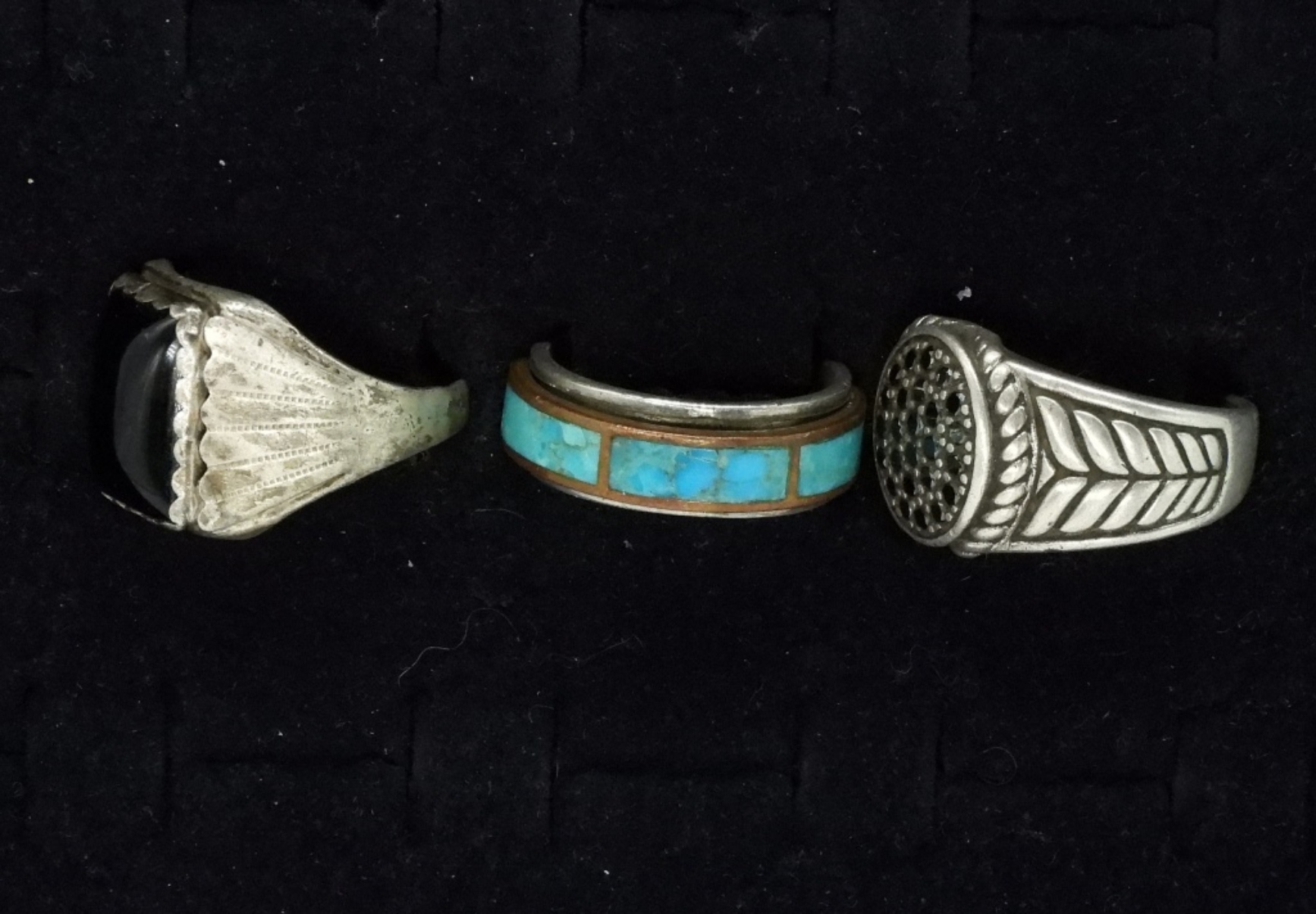 Three sterling men’s fashion rings. Turquoise and Black Onyx. Sizes 11-12 (23.8 dwt)