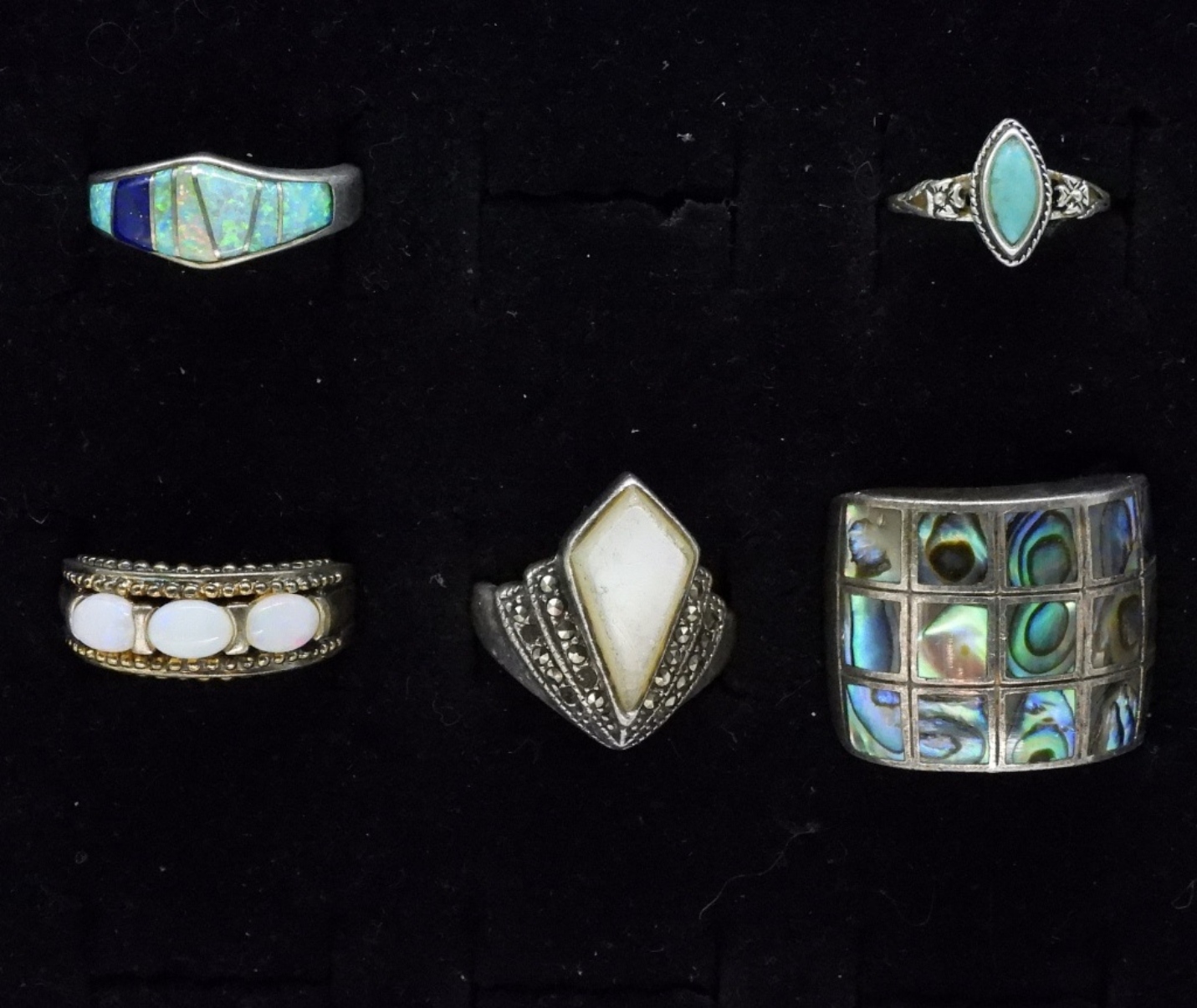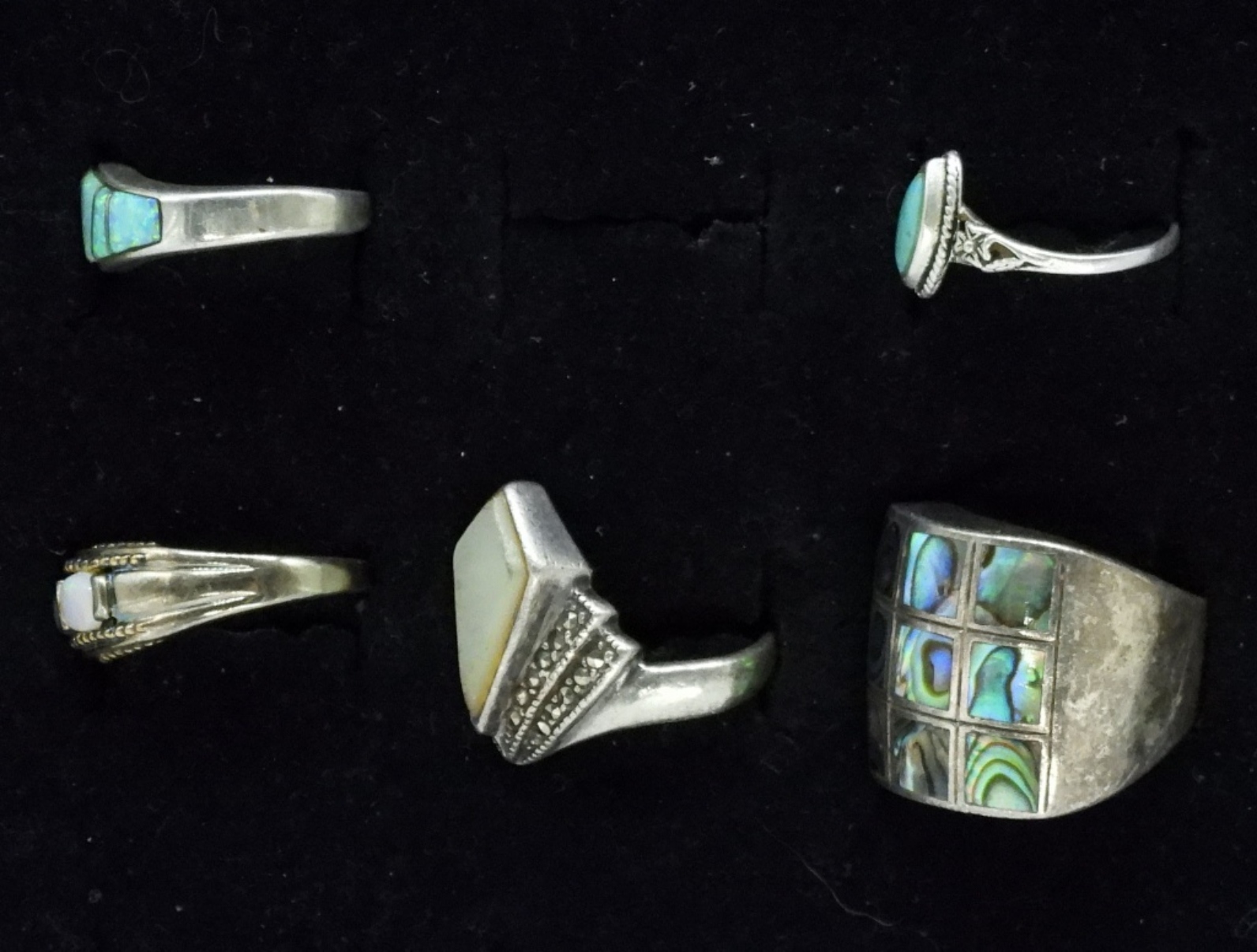 Five sterling rings. Abalone, Mother of Pearl, Turquoise, Opal. Sizes 4-7 (17 dwt)