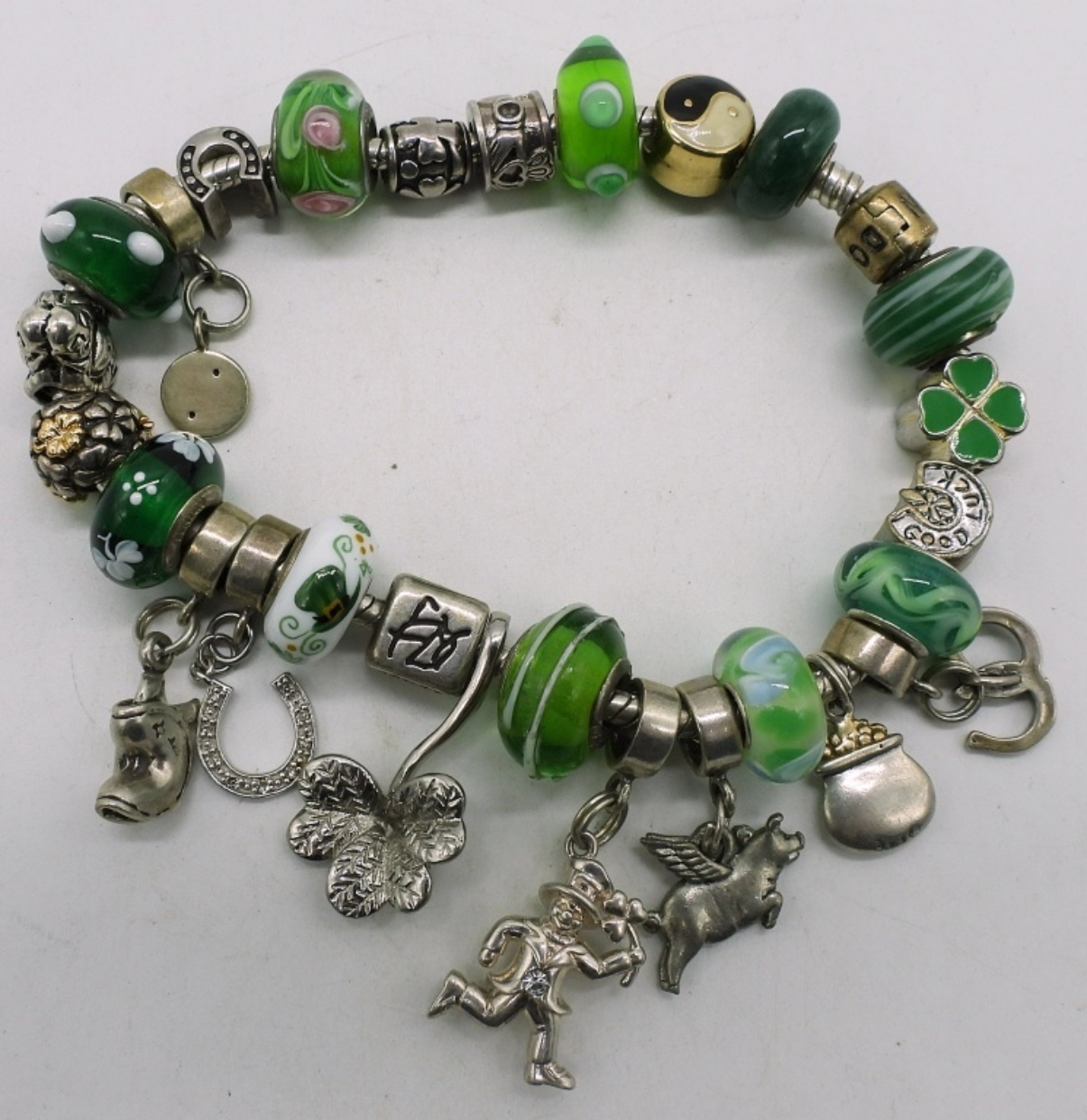 Pandora sterling charm bracelet with 27 charms. Mostly green and st patricks day charms. (45 dwt)