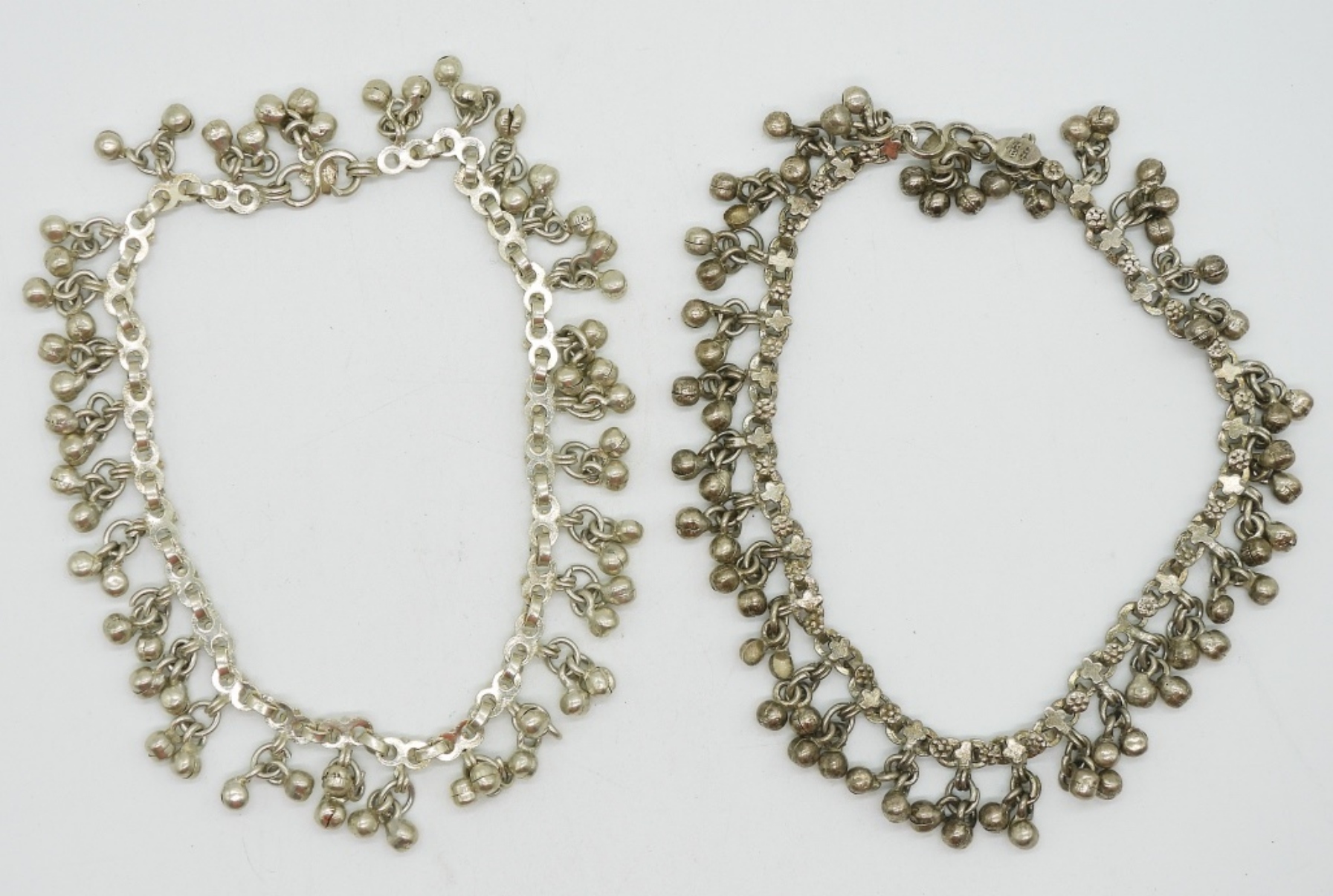 Two silver (80%) anklets with jingly bells. Both are 9″. (29 dwt)